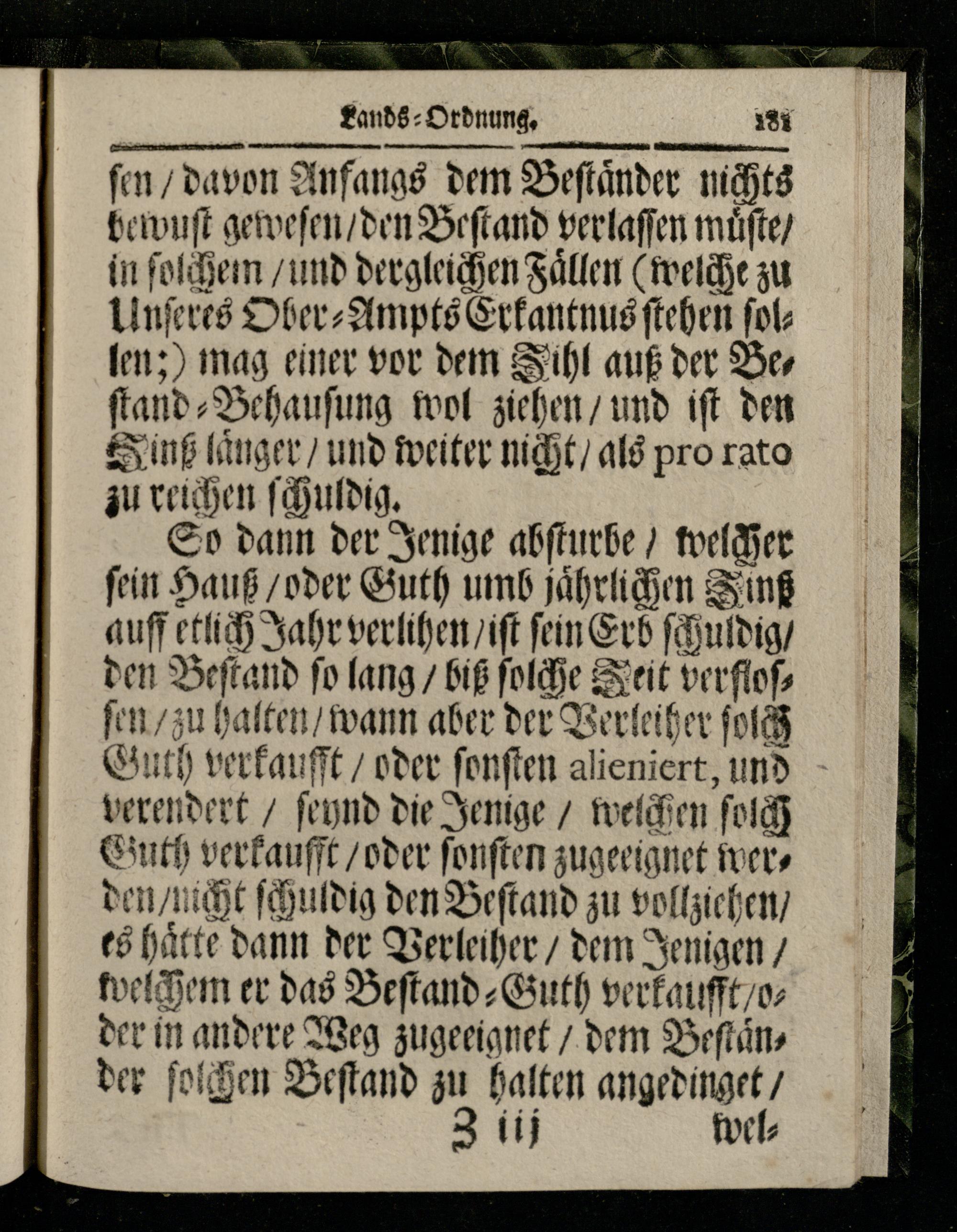 So dann der Jenige abſturbe/ welcher fein Hauß/ oder Guth umb jaͤhrlichen Jinß auff etlich Jahr verlihen/ iſt fein Erb ſchuldig/ den Beſtand fo lang/ biß ſolche Reit verfloſſen/ zu halten/ wann aber der Verleiher ſolch Guth verkaufft/ oder ſonſten alieniert, und verendert/ ſeynd die Jenige/ welchen ſolch Guth verkaufft/ oder ſonſten zugeeignet werden/ nicht ſchuldig den Beſtand zu vollziehen/ es hatte dann der Verleiher/ dem Jenigen/ vel Jem er das Beſtand⸗Guth verkaufft/ o der in andere Weg zugeeignet/ dem Beſtaͤnder ſolhen Beſtand zu halten angedinget/