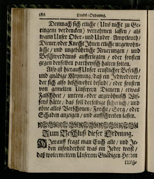 Demnach ſich etliche(Uns nicht zu Geringem verdencken) vernehmen laſſen/ als wann Unſer Ober⸗ und Under Amptleuth/ Diener/ oder Knecht Ihnen etliche ungewohnliche/ und ungebuͤhrliche Neuerungen/ und Beſchwerdtnus aufferlegten/ oder ſonſten gegen denſelben partheyiſch halten ſolten.