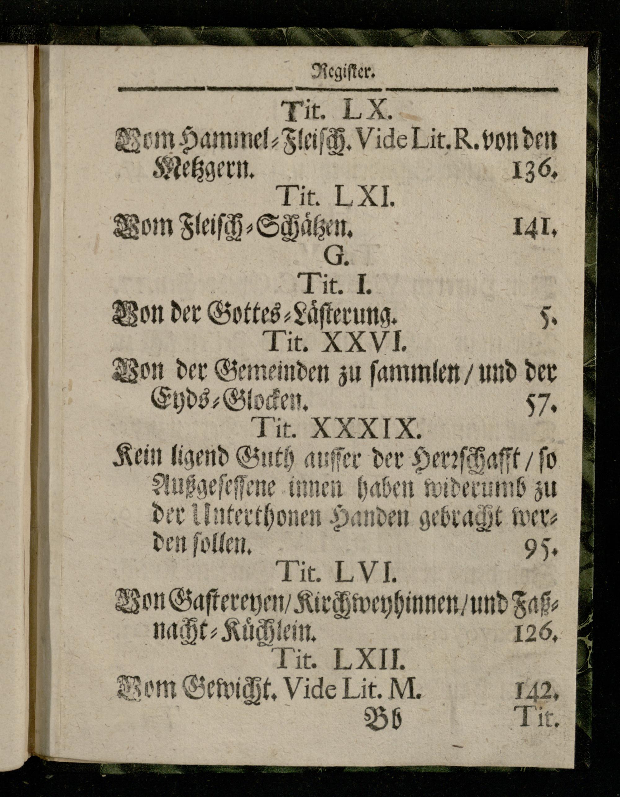 ö Von der Gottes⸗Laͤſterung. Tit. XXVI. Von der Gemeinden zu ſammlen/ und der Ehds⸗Glocken. 57. Tit. N NXIX Kein ligend Guth auſſer der Herꝛſchafft/ ſo Außgeſeſſene innen haben widerumb zu den ſollen. 95. Tit. LMI Von Gaſtereyen/ Kir hweyhinnen/ und Zaßnacht⸗Kuͤchlein. 126. Tit. LXII. Dom Gewicht. Vide Lit. M. 142. Bb 11