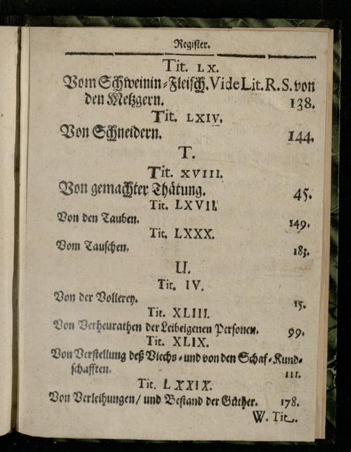 Von Yerheurathen der Leibeigenen Perſoneen. 99. . 2 Von Verſtellung deß Viech und von den Schaf⸗⸗Kundſchafften. 111. Vit.. TI Von Verleihungen/ und Beſtand der Gunther. 178. W. Tit