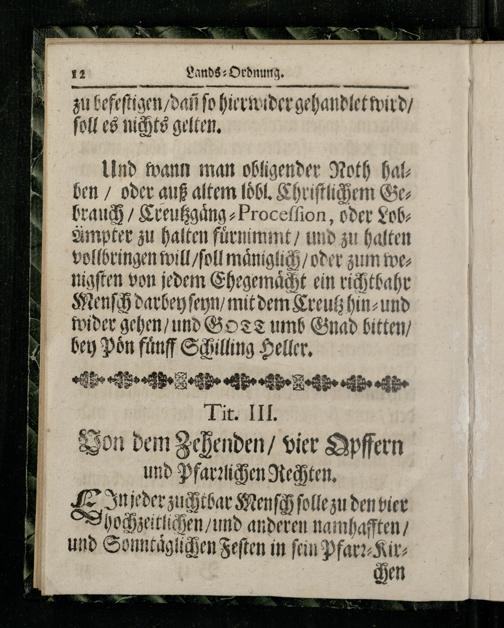Und wann man obligender Noth hal ben/ oder auß altem löͤbl. Chriſtlichem Gebrauch/ Creutzgaͤng⸗Proceſſion, oder LobÄmpter zu halten fuͤrnimmt/ und zu halten vollbringen will/ ſoll maͤniglich/ oder zum wenigſten von jedem Ehegemaͤcht ein richtbahr Menſch darben ſeyn/ mit dem Kreutz hin⸗ und wider gehen/ und GOTT umb Gnad bitten/ bey Poͤn fuͤnff Schilling Heller.
