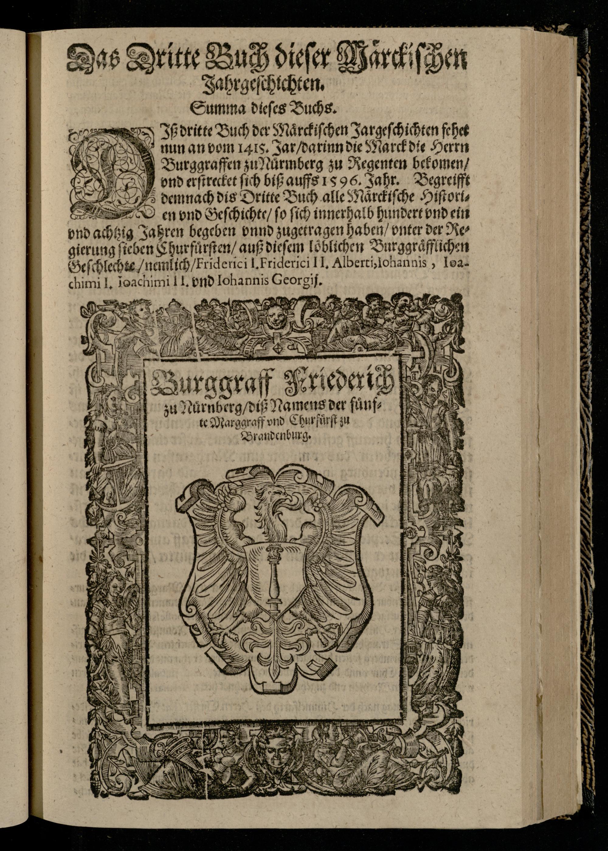 8 S Iß dritte Buch der Maͤrckiſchen Jargeſchichten fehet . nun an vom 1415. Jar/ darinn die Marck die Herrn Burggrafen zu Nürmberg zu Regenten hekoömen/ 3. ond erſtrecket ſich biß guffs 1596. Jahr. Begreifft ., demnach dis Dritte Buch alle sMNaͤrckiſche HiſtoriR WD en vnd Geſchichte/ fo ſich innerhalb hundert vnd ein vnd achtzig Jahren begeben vnnd zugetragen haben/ vnter der Re