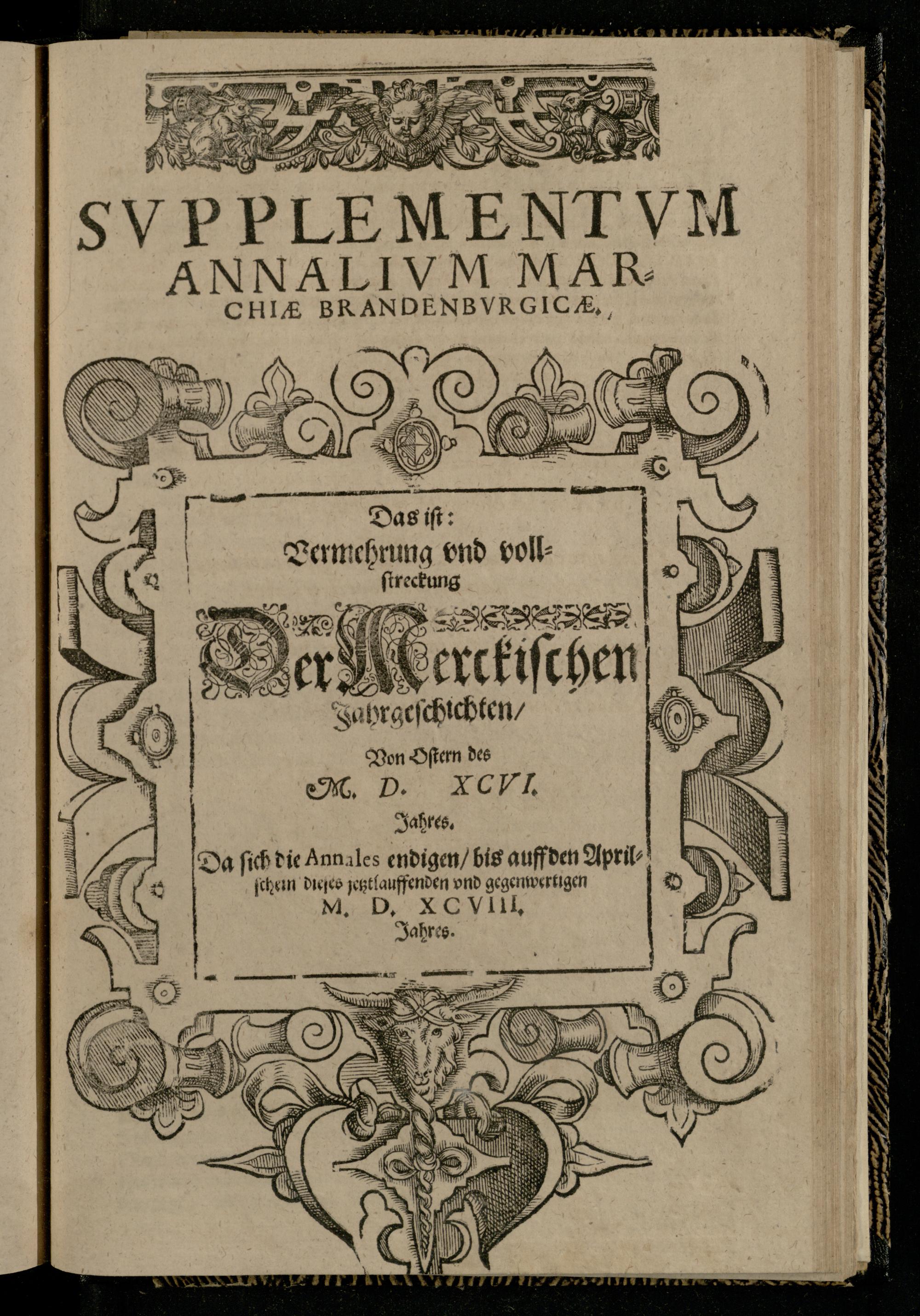Annales Marchiae|| Brandenbvrgicæ,|| das ist|| Ordentliche|| Verzeichnuß vn|| beschreibung der fürnemsten vnd|| gedenckwirdigsten Märckischen Jahrgeschichten vnd Historien,|| so sich vom 416. Jahr vor Christi Geburt, bis auffs 1596. Jahr|| im Churfürstenthumb Brandenburg, vnd dazu gehörenden Landen vnd|| Herrschafften, von Jahr zu jahr begeben vnd|| zugetragen haben.|| Aus vielen glaubwirdigen Scribenten vnd Büchern, auch aus|| bewerten vrkunden vnd vielen alten monumentis, zusam-||men getragen vnd beschrieben.|| Auch mit vielen Bildnüssen vnd Figuren gezieret, vnd mit einem vollkom-||menen vnd richtigem Register verfasset,|| Durch|| M. Andream Angelvm, Strvthiomon-||tanvm.||