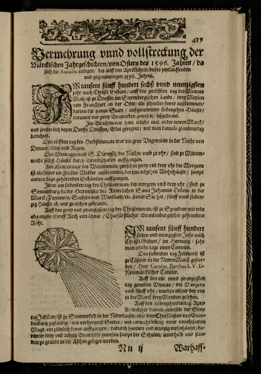 Item/ am ſiebenden tag des Chriſtmonats/ des morgens vmb drey vhr/ find zu Sonnenburg/ da der Heermeiſter des Ritterlichen Sanct Johannis Vrdens in der Marck/ Pommern/ Sachſen vnd Wendland/ etc. ſeinen Sitz hat/ fünff vnnd ſiebenzig Haͤuſer ab/ vnd zu aſchen gebrandt.