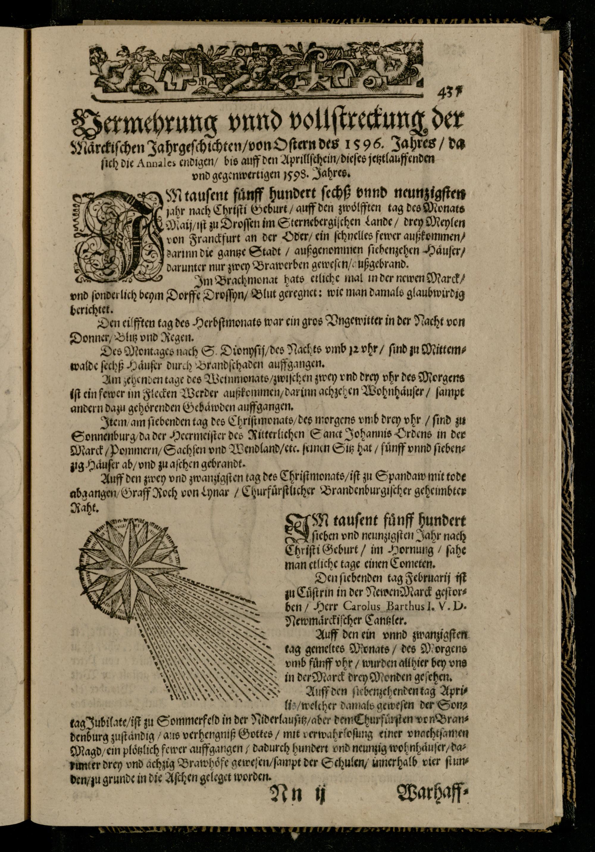 in der Marck drey Monden geſehen. Auff den ſiebenzehenden tag Aprilis/ welcher damals geweſen der Sontag Jubilate/ iſt z Sommerfeld in der Niderlauſitz/ aber dem Chur fuͤrſten von Brandendurg zuſtaͤndig/ aus verhengniß Gottes/ mit verwahr loſung einer vnachtſamen Magd/ ein plotzlich fewer auffgangen/ dadurch hundert ond neunzig woh nhaͤuſer/ darimter drey vnd achzig Brawhöͤfe geweſen/ ſampt der Schulen/ innerhalb vier ſiunden/ ju grunde in die Aſchen geleget worden.