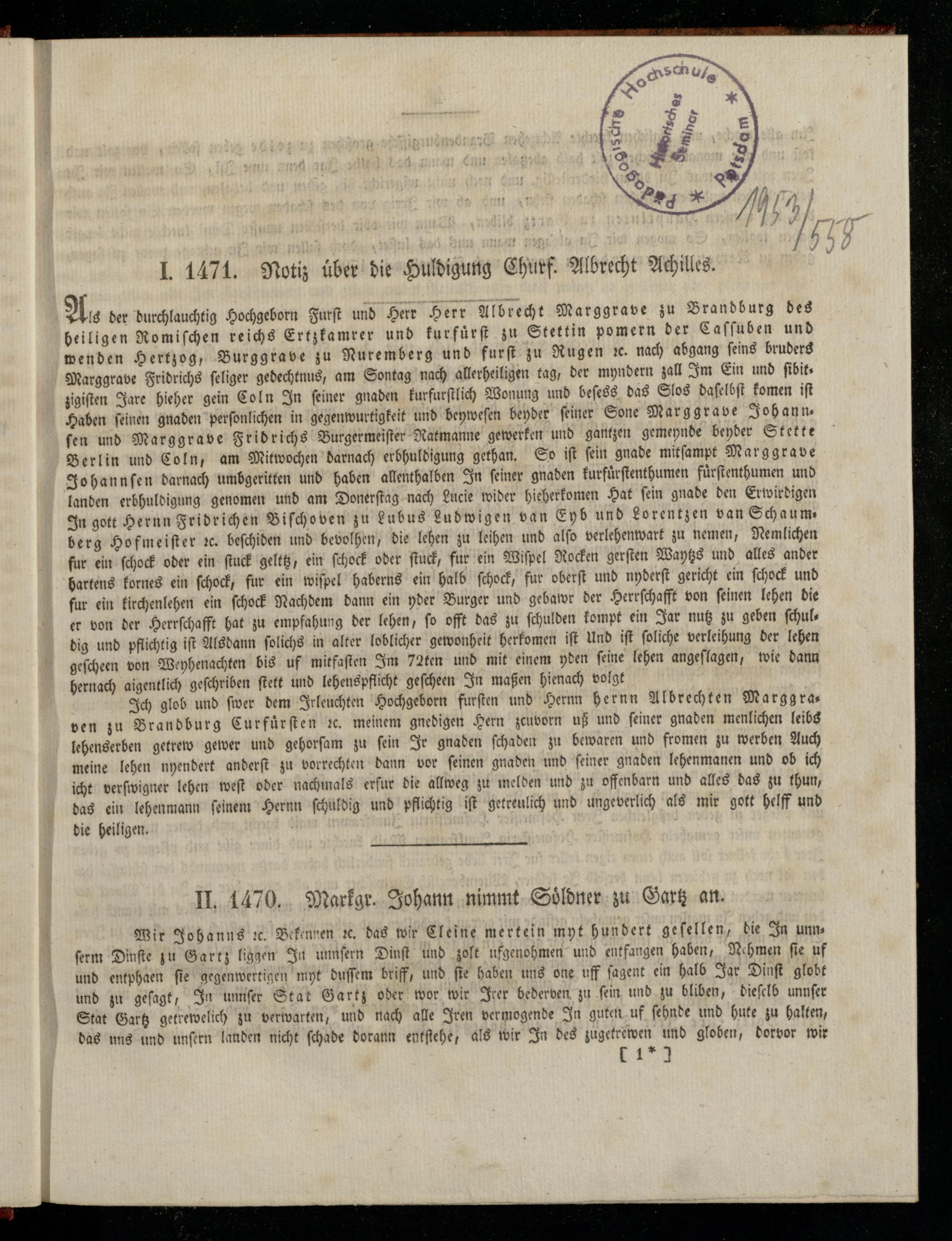 As der durchlauchtig Hochgeborn Furſt und Herr Herr Albrecht Marggrave zu Brandburg des beiligen Romiſchen reichs Ertzkamrer und kurfürſt zu Stettin pomern der Caſſuben und wenden Hertzog, Burggrave zu Nuremberg und furſt zu Rugen ꝛc. nach abgang ſeins bruders Marggrave Fridrichs ſeliger gedechtnus, am Sontag nach allerheiligen tag, der myndern zall Im Ein und ſibitzigiſten Jare hieher gein Coln In ſeiner gnaden kurfurſtlich Wonung und beſess das Slos daſelbſt komen iſt Haben ſeinen gnaden perſonlichen in gegenwurtigkeit und beyweſen beyder ſeiner Sone Marggrave Johann ſen und Marggrave Fridrichs Burgermeiſter Ratmanne gewerken und gantzen gemeynde beyder Stette Berlin und Coln, am Mitwochen darnach erbhuldigung gethan. So iſt fein gnade mitſamPpt Marggrave Johann ſen darnach umbgeritten und haben allenthalben In ſeiner gnaden kurfuͤrſtenthumen fuͤrſtenthumen und landen erbhuldigung genomen und am Donerſtag nach Lucie wider hieherkomen Hat ſein gnade den Erwirdigen In gott Hernn Fridrichen Biſchoven zu Lubus Ludwigen van Eyb und Lorentzen van Schaum— berg Hofmeiſter ꝛc. beſchiden und bevolhen, die lehen zu leihen und alſo verlehenwart zu nemen, Nemlichen fur ein ſchock oder ein ſtuck gelttz, ein ſchock oder ſtuck, fur ein Wiſpel Rocken gerſten Waytzs und alles ander hartens kornes ein ſchock, fur ein wiſpel haberns ein halb ſchock, fur oberſt und nyderſt gericht ein ſchock und fur ein kirchenlehen ein ſchock Nachdem dann ein yder Burger und gebawr der Herrſchafft von ſeinen lehen die er von der Herrſchafft hat zu empfahung der lehen, ſo offt das zu ſchulden kompt ein Jar nutz zu geben ſchuldig und pflichtig iſt Alsdann ſolichs in alter loblicher gewonheit herkomen iſt Und iſt ſoliche verleihung der lehen geſcheen von Weyhenachten bis uf mitfaſten Im Taten und mit einem yden ſeine lehen angeſlagen, wie dann hernach aigentlich geſchriben ſtett und lehenspflicht geſcheen In maßen hienach volgt