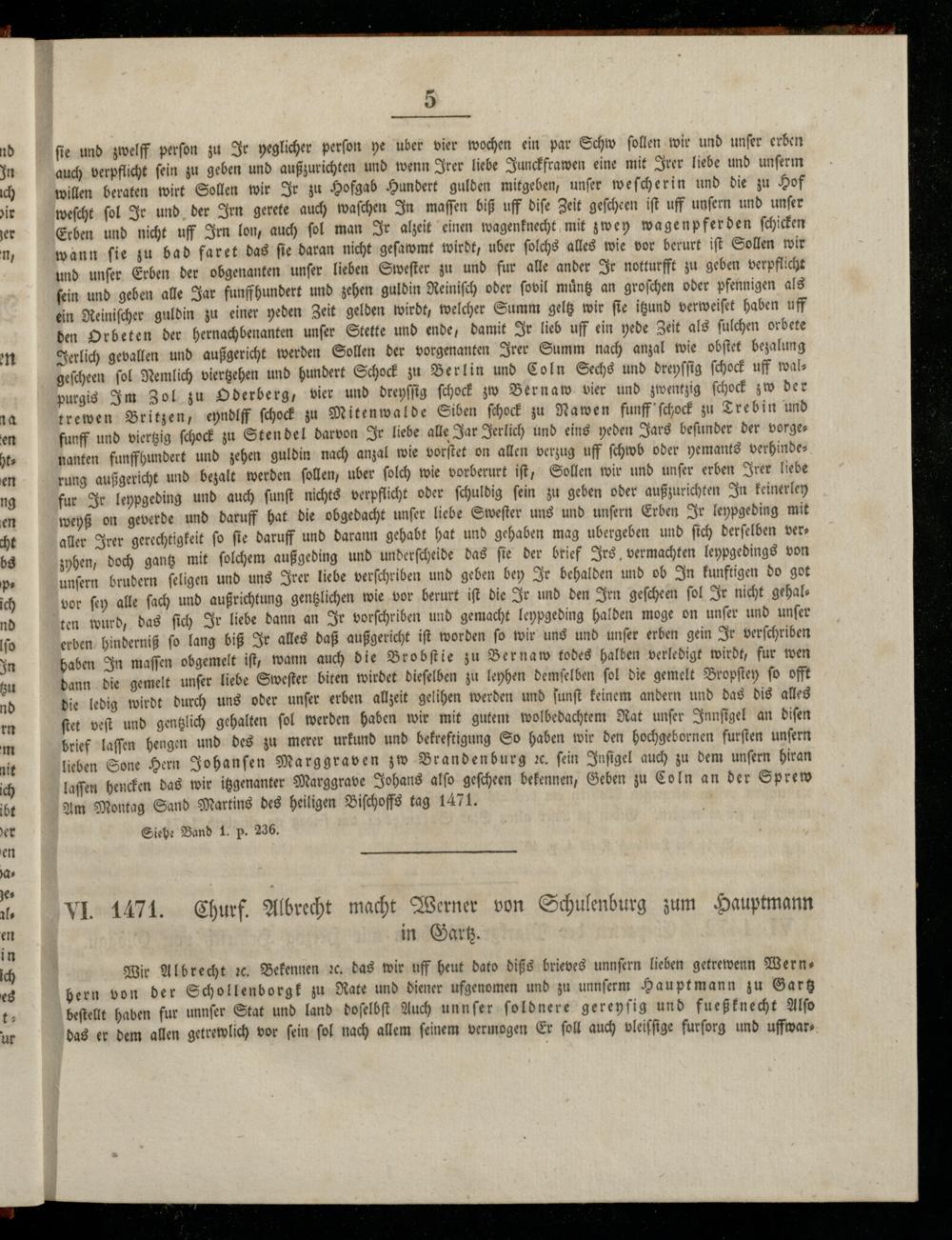 fie und zwelff perſon zu Ir yeglicher perſon ye uber vier wochen ein par Schw ſollen wir und unſer erben auch verpflicht ſein zu geben und außzurichten und wenn Irer liebe Junckfrawen eine mit Irer liebe und unſerm willen beraten wirt Sollen wir Ir zu Hofgab Hundert gulden mitgeben, unſer weſcherin und die zu Hof weſcht ſol Ir und der Irn gerete auch waſchen In maſſen biß uff diſe Zeit geſcheen iſt uff unſern und unſer Erben und nicht uff Irn lon, auch ſol man Ir alzeit einen wagenknecht mit zwey wage np fer den ſchicken wann ſie zu bad faret das ſie daran nicht geſawmt wirdt, uber ſolchs alles wie vor berurt iſt Sollen wir und unſer Erben der obgenanten unſer lieben Sweſter zu und fur alle ander Ir notturfft zu geben verpflicht ſein und geben alle Jar funffhundert und zehen guldin Reiniſch oder ſovil muͤntz an groſchen oder pfennigen als ein Reiniſcher guldin zu einer yeden Zeit gelden wirdt, welcher Summ geltz wir ſie itzund verweiſet haben uff den Orbeten der hernachbenanten unſer Stette und ende, damit Ir lieb uff ein yede Zeit als ſulchen orbete Jerlich gevallen und außgericht werden Sollen der vorgenanten Irer Summ nach anzal wie obſtet bezalung geſcheen fol Nemlich viertzehen und hundert Schock zu Berlin und Coln Sechs und dreyſſig ſchock uff walpurgis Im Zol zu Oderberg, vier und dreyſſig ſchock zw Bernaw vier und zwentzig ſchock zw der trewen Britzen, eyndlff ſchock zu Mitenwalde Siben ſchock zu Nawen funff ſchock zu Trebin und funff und viertzig ſchock zu Sten del darvon Ir liebe alle Jar Jerlich und eins yeden Jars beſunder der vorgenanten funffhundert und zehen guldin nach anzal wie vorſtet on allen verzug uff ſchwb oder yemants verhinderung außgericht und bezalt werden ſollen, uber ſolch wie vorberurt iſt, Sollen wir und unſer erben Irer liebe fur Ir leypgeding und auch ſunſt nichts verpflicht oder ſchuldig ſein zu geben oder außzurichten In keinerley weyß on geverde und daruff hat die obgedacht unſer liebe Sweſter uns und unſern Erben Ir leypgeding mit aller Irer gerechtigkeit ſo ſie daruff und darann gehabt hat und gehaben mag ubergeben und ſich derſelben vers zyhen, doch gantz mit ſolchem außgeding und underſcheide das ſie der brief Irs vermachten leypgedings von unſern brudern ſeligen und uns Irer liebe verſchriben und geben bey Ir behalden und ob In kunftigen do got vor ſey alle ſach und außrichtung gentzlichen wie vor berurt if die Ir und den Irn geſcheen fol Ir nicht gehalten wurd, das ſich Ir liebe dann an Ir vorſchriben und gemacht leypgeding halden moge on unſer und unſer erben hinderniß ſo lang biß Ir alles daß außgericht iſt worden ſo wir uns und unſer erben gein Ir verſchriben haben In maſſen obgemelt iſt, wann auch die Brobſtie zu Bernaw todes halben verledigt wirdt, fur wen dann die gemelt unſer liebe Sweſter biten wirdet dieſelben zu leyhen demſelben ſol die gemelt Bropſtey ſo offt die ledig wirdt durch uns oder unſer erben allzeit gelihen werden und ſunſt keinem andern und das dis alles ſtet veſt und gentzlich gehalten ſol werden haben wir mit gutem wolbedachtem Rat unſer Innſigel an diſen brief laſſen hengen und des zu merer urkund und bekreftigung So haben wir den hochgebornen furſten unſern lieben Sone Hern Johanſen Marggraven zw Brandenburg zc. fein Inſigel auch zu dem unſern hiran laſſen hencken das wir itzgenanter Marggrave Johans alſo geſcheen bekennen, Geben zu Coln an der Sprew Am Montag Sand Martins des heiligen Biſchoffs tag 1471.