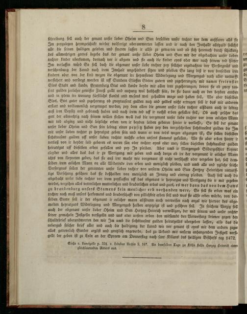 und in ydem ire wonung fuͤrſtlichs ſtands und weſens wol gehallten moge und haben ſoll, Wo aber dieſelben Slos, Stet guter und zugehorung ob zweytauſent gulden nutz und geldes nicht ertrugen ſoll ir das mit anderem erſtatt und volkumenlich vergenuget werden, pey dem allen die genant unſer liebe tochter alßdann auch in lebtag auß iren Beyſitz und gebrauch haben und nach irem tod uff ir nechſt erben gefallen ſoll, Ob auch geſchee das gott der allmechtig nach ſeinem willen ſtellen woll das die vorgenant unſer liebe tochter vor irem eelichen Mann mit tod abging und nicht leipliche erben von ir beyden leiben geboren hinter ir verlieſſe, So ſoll der genant unſer lieber Oheim und Sun fein lebtag einen peyſitz haben pen den vorgeſchriben ſechstauſent gulden die Im mit unſer lieben tochter zu heyratgut geben ſein und wann er von tods wegen abgangen iſt, So ſollen dieſelben ſechstauſent gulden uff unſer lieben tochter nechſte erben unſers ſtamens gefallen, Wo ſie aber erben hinter ir verließ von ir beyder leib geboren es weren fün oder tochter eyns oder mer, ſollen dieſelben ſechstauſent gulben heiratsgut uff dieſelben erben gefallen und pey In pleiben. Aber umb ir Morgengab Silbergeſchirr kleynot cleyder und alles das das ir zu Vertigung mit geben und auch dorzu ob ire der vorgenant ir eelicher Mann ichts von kleynoten geben, das ſie auß irer macht wie vorgenant iſt nicht verſchafft oder vergeben hat, ſoll demſelben irem eelichen Mann on alle Widerrede iren erben und meniglich pleiben, und umb alle und ygliche ſolche Verſorgnus ſollen der genannten unſer lieben tochter von unſerm Oheim und Sun Hertzog Heinrichen notturfftige Verſehung geſcheen das ſie deßhalben von meniglich an Irrung und eintrag pleiben. Auch ſoll auch die obgedacht unſer liebe tochter vor irem peyſlaffen uff das obgenant ir heyratgut und Vertigung die ir mit gegeben wir det, verzeihen alles vetterlichen mutterlichen und bruderlichen erbes und guts, es wer dann das von dem Haws zu brandenburg unſers Stamens kein menlicher erb vorhanden were, So ſoll ſie erben was ein tochter nach maß unſers herkomens und bruderſchafft von pillichkeit erben ſoll und was fie allſo erben würde, von ders ſelben Sume ſoll ir der obgenant ir eelicher mann allßdann auch verweiſen nach anzal wie hiervor des obgemelten heyratguts Widerlegung und Morgengab halben angezeigt iſt und geſcheen ſoll. In ſolchem Verzig fol auch der obgenant unſer lieber Oheim und Sun Hertzog Heinrich verwilligen, der mit ſeinem und unſer tochter ſeiner gemaheln Inſigelln verſigelln und uns oder unſern erben den mitſambt den Verweiſung brieven gegen den ſchuldtbrief uberandworten den wir Im umb die ſechstauſent gulden heiratgellts ubergeben laſſen, alſo das die uebergab ſolcher brief aller und auch die huldigung der Lannd wie vor genant iſt eyns mit dem andern zugee alles getrevelich Sunder argliſt und gentzlich ongeverde, des zu Urkund mit unſerm anhangenden Inſigell verſigellt der geben iſt zu Coln an der Spreew am Donnerſtag nach ſant Kilians des heilligen Biſchofs tag 1472.
