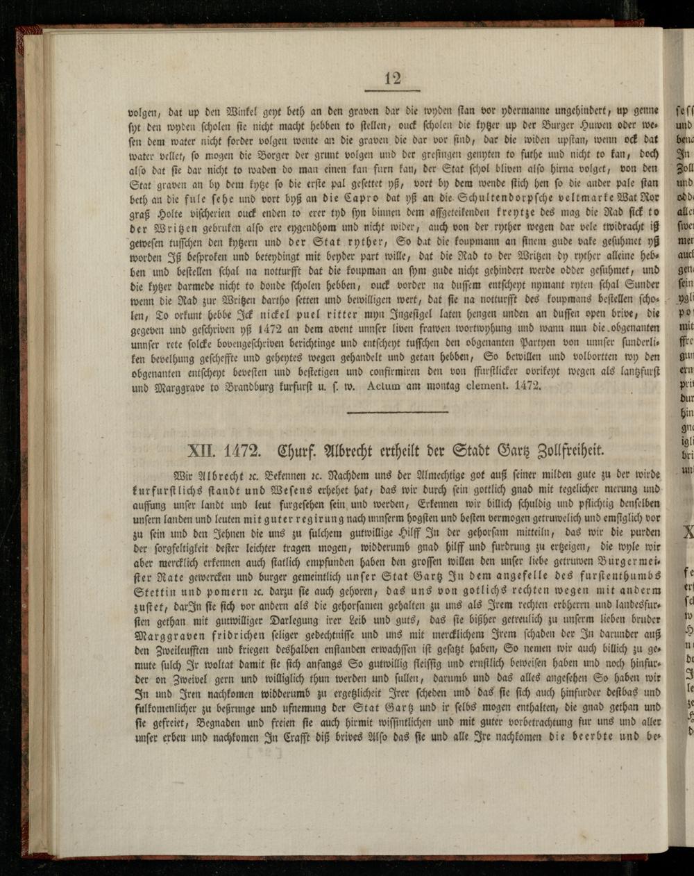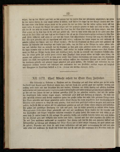 XII. 1472. Churf. Albrecht ertheilt der Stadt Gartz Zollfreiheit.