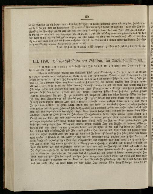 Teinenn undertenigen willigen und fruntlichen Dinſt zuvor Erwirdigen In got vetir gnedigen wirdigen edeln und wolgebornn Geſtrengen und Ern veſten Erbaren und Er ſamen liebin Hern forderer und frund Ich bin geſeſſen mit Lodewige kuchmeiſter ſeliger itzwan Burg ſaße ztu Berlin In geſampten lehnen nach lawte mynes briffes den Ich von mynem gnebigen hern Marggraven albrechte habe Alßo iſt nu die ſelbte Ladewich kuchmeiſter vorſtorben und von ſtund nach ſeinem tode habe Ich volge gethan und geſunnen von mym gnedigen Hern Marggraven albrechte und ſeinen gnaden mit gantzem fleiſſe demutiglichin gebeten mir und mynen lehnserben ſulche feiner furſtlichin gnaden gethane lehne zu vernawenne die guter In ztu antworten und volgen ztu laſſen und ſulche demutige fliſſige bete habe Ich nicht eyns Sundern ofte und vilmals gethan In eigener perſone und durch andern vor mich thun laßen Nemlich durch mynen gnedigin Hern Marggraven Hanße mynen gnedigin Hern von lubbus Hern Jurgen von waldenfels Hern Nickel pfuel und mher lewten die manicherley Handel derhalben tzwiſſchen feinen gnaden und mir gethan haben und habe das fo gutlich und demutiglich geſucht und ſuchen laßen das ich nicht weiß wie ichs beqwemir und demutiglicher kegin ſeinen gnaden ſuchen ſulde, das mir und mynen ſonen bißher unhilfflich geweßt iſt Ouch haben die Irlauchtenn Houchgebornnen furſten myne gnedige liebin Hern von