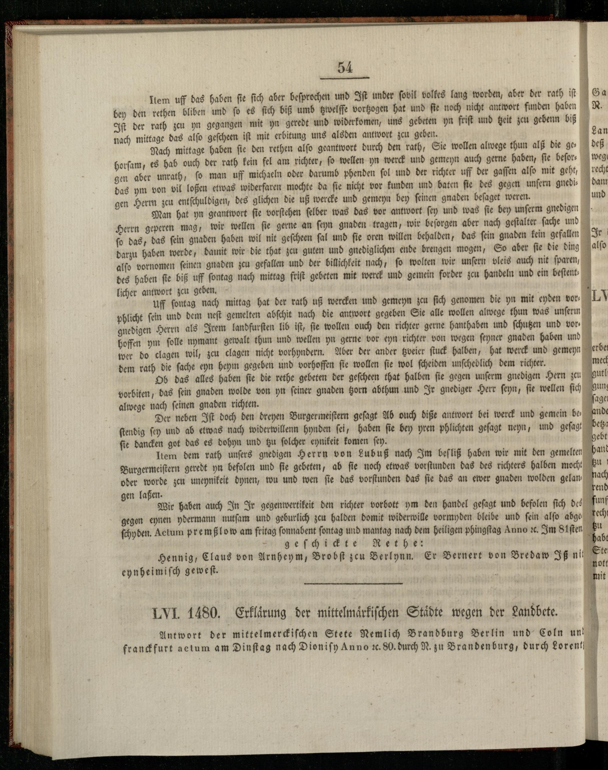 LVI. 1480. Erklaͤrung der mittelmaͤrkiſchen Städte wegen der Landbete.