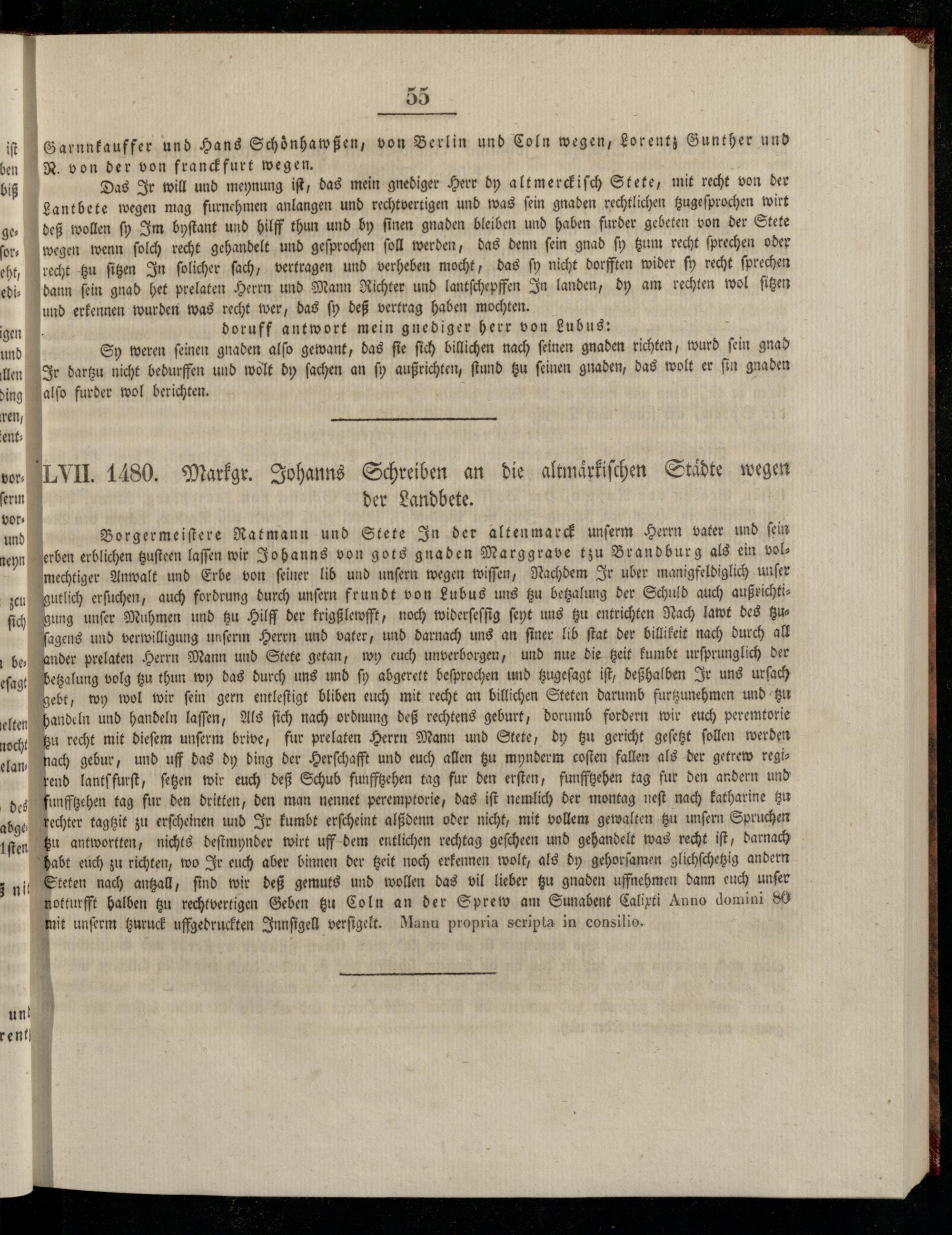 | Borgermeiſtere Ratmann und Stete In der altenmarck unſerm Herrn vater und ſein erben erblichen tzuſteen laſſen wir Johanns von gots gnaden Marggrave tzu Brandburg als ein vol mechtiger Anwalt und Erbe von ſeiner lib und unſern wegen wiſſen, Nachdem Ir uber manigfeldiglich unſer gutlich erſuchen, auch fordrung durch unſern frundt von Lubus uns tzu betzalung der Schuld auch außrichtigung unſer Muhmen und tzu Hilff der krigßlewfft, noch widerſeſſig ſeyt uns tzu entrichten Nach lawt des tzuſagens und verwilligung unſerm Herrn und vater, und darnach uns an ſiner lib ſtat der billikeit nach durch all ander prelaten Herrn Mann und Stete getan, wy euch unverborgen, und nue die tzeit kumbt urſprunglich der betzalung volg Eu thun wy das durch uns und ſy abgerett beſprochen und tzugeſagt iſt, deßhalben Ir uns urſach gebt, wy wol wir fein gern entleſtigt bliben euch mit recht an billichen Steten darumb furtzunehmen und tzu handeln und handeln laſſen, Als ſich nach ordnung deß rechtens geburt, dorumb fordern wir euch peremtorie tzu recht mit dieſem unſerm brive, fur prelaten Herrn Mann und Stete, dy tzu gericht geſetzt ſollen werden nach gebur, und uff das dy ding der Herſchafft und euch allen tzu mynderm coſten fallen als der getrew regirend lantſ furſt, ſetzen wir euch deß Schub funfftzehen tag fur den erſten, funfftzehen tag fur den andern und funfftzehen tag fur den dritten, den man nennet peremptorie, das iſt nemlich der montag neſt nach katharine tzu techter tagtzit zu erſcheinen und Ir kumbt erſcheint alßdenn oder nicht, mit vollem gewalten tzu unſern Spruchen tzu antworten, nichts deſtmynder wirt uff dem entlichen rechtag geſcheen und gehandelt was recht iſt, darnach habt euch zu richten, wo Ir euch aber binnen der tzeit noch erkennen wolt, als dy gehorſamen glichſchetzig andern Steten nach antzall, ſind wir deß gemuts und wollen das vil lieber tzu gnaden uffnehmen dann euch unſer notturfft halben tzu rechtvertigen Geben tzu Coln an der Sprew am Sunabent Calixti Anno domini 86 mit unſerm tzuruck uffgedruckten Innſigell verſigelt. Manu propria seripta in consilio.