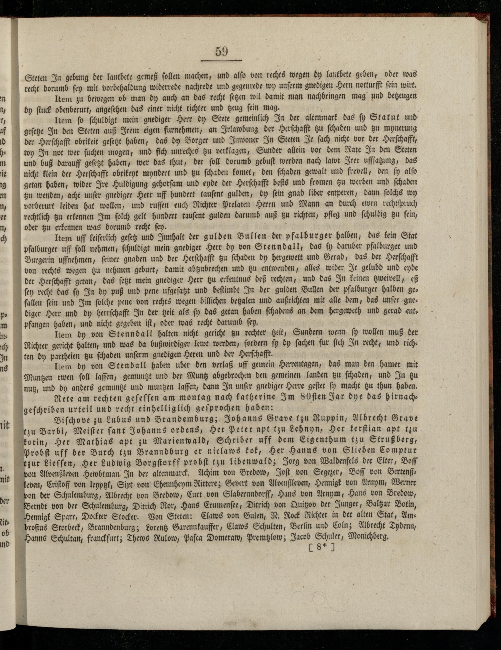 und buß darauff geſetzt haben, wer das thut, der ſoll dorumb gebuſt werden nach lawt Irer uffſatzung, das nicht klein der Herſchafft obrikeyt myndert und tzu ſchaden komet, den ſchaden gewalt und frevell, den ſy alſo getan haben, wider Ire Huldigung gehorſam und ende der Herſchafft beſts und fromen tzu werben und ſchaden tzu wenden, acht unſer gnediger Herr uff hundert tauſent gulden, dy ſein gnad liber entperen, dann ſolchs wy vorberurt leiben hat wollen, und ruffen euch Richter Prelaten Herrn und Mann an durch ewrn rechtſpruch