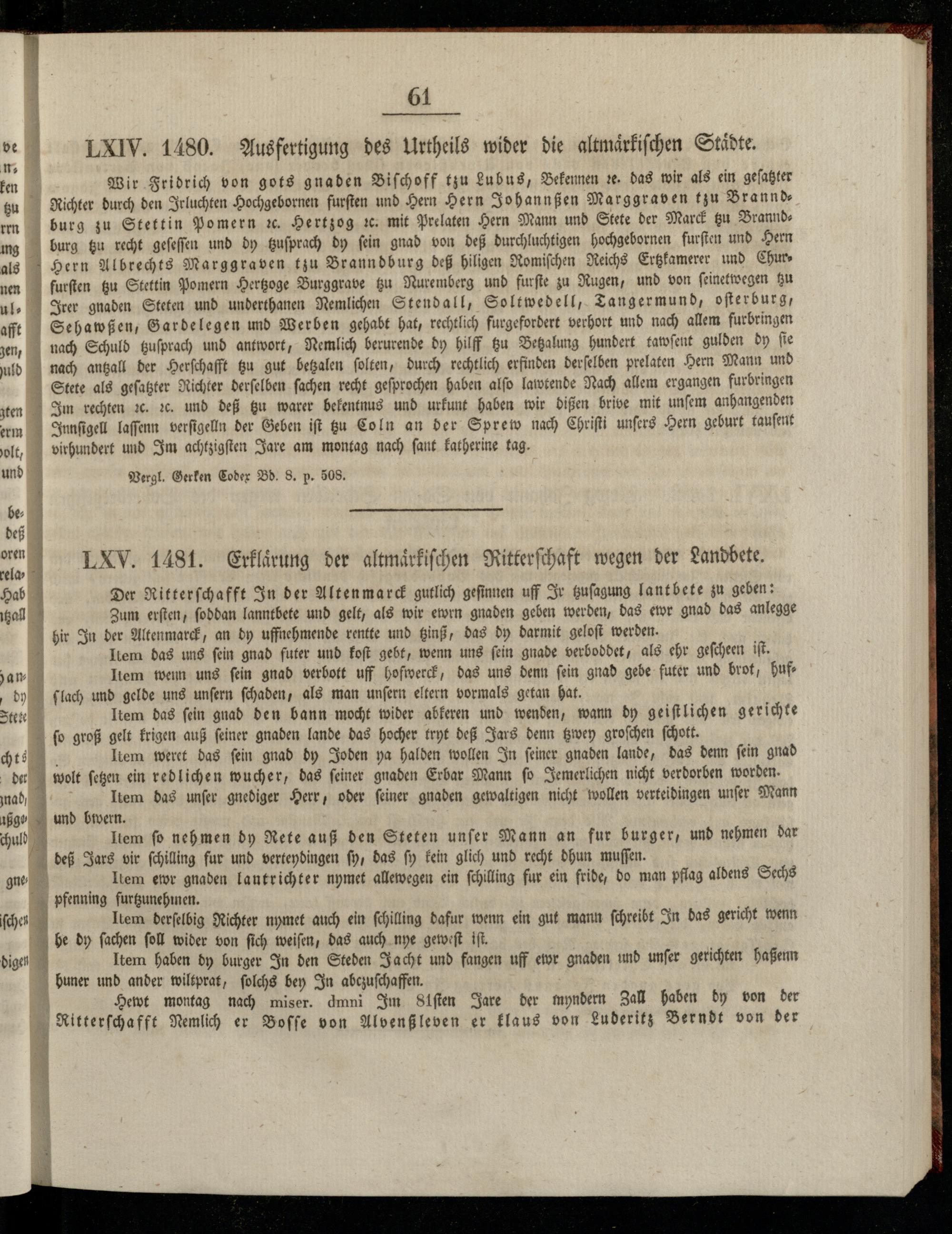 LXIV. 1480. Ausfertigung des Urtheils wider die altmaͤrkiſchen Städte.