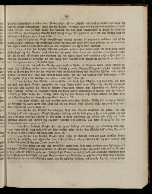 Maieſtat briff unde anhangender Maieſtat Ingeſigel boſtetigt, uns die land gelegen, ſie an uns gewiſet alle und yede Griff unde privilegia glichſan fie von worte zu worte außgedruckt vor boſtetigt unde globt uns darbie hanthaben ſchuttzen und ſchirmen Alz daz feiner Maieſtat briff außwiſet, Der geben iſt zu Ofen Am tage Conceptionis marie Anno c. 77. Item Seine konigliche Maieſtat hat unſer gemal boſtetigt und vorlegen eyn vormechtniß unde lipge— dinge, damit wir fie durch unſer briff und Sigil verſehen haben Alz daz ſiner Maieſtat briff meldet, Der geben if zu Ofen Am Dornſtag vor Margarethe Anno 78. Item Eß hat feine koniglich Maieſtat Ahm Jungſt zu Olmuͤtz Allen und yeden Sleſiſchen ffurſten