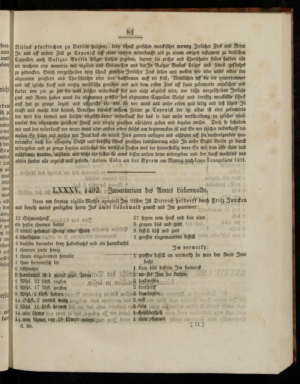 tember den obgnanten prieſtern Funff und virtzig groſchen ußrichten geben und bezalen wollet. Doch ſo behalten w wir uns den widerkauff vor wenn unns oder unſern erben ſolchs am beqwemeſten iſt und So wir ſolchin widerkauff ton wollen So ſollen und wollen wir Inen das ein virteil Jars zuvorn aufſagen und alßdann uff die nachvolgenden qua tertember nach der ufſagung Sechs und dreiſſig ſchock groſchen landßwerung alhir In unſer Stadt Berlin zu danck widergeben und zu gnuge bezalen mitſampt ben vetſeſſen Zinßen wes der hinderſtellig were So wir dem alſo thun und hachkomen wurden, alßdann und nicht ehr ſollen fie unns diſſen unſern brive widergeben und der kauff machtlos und abſein ſunder alle argeliſt und geferde. Aelum Coln an der Sprew am Mantag nach Luce Evangeliste 1491. LXXXV 1492. Inventarium des Amtes Liebenwalde. Item am freytag vigilia Mathie apos oli Im 92ſten Iſt Dittrich heldorff durch Fritz Juncken aus bevelh meins gnedigſten herrn Ins ambt lie ben wald geweſt und Im geantwort: 12 Schweinſpieſſſẽ 57 ſeyten new ſpeck und kein alter ein halbe thunnen butter grapen boͤs und gutt 3 virteil geſampt Honig einer keſſell bSß und gutt 46ſchafſchern— un 1 groſſen eingemauerten keſſell 4 buchſen darunder drey halenbuchs und ein e, thunnen pacht honig Im vorwerkh: 1 thunn eingebrawen hovebir—— 1 groſſen keſſell im vorwerkh do man den ſwein Inne 1 thun bernowiſch bir kocht