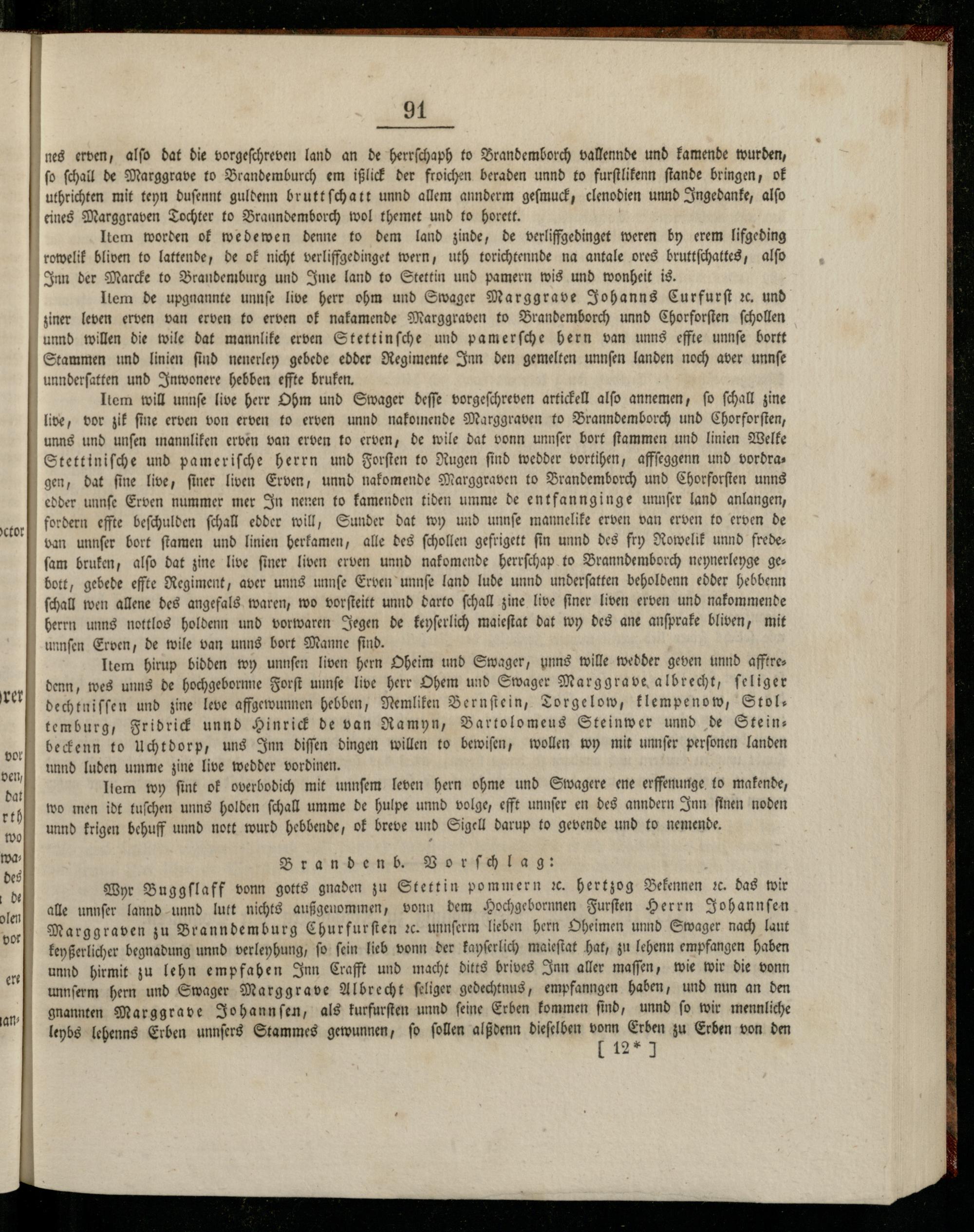 Ilem de upgnannte unnſe live herr ohm und Swager Marggrave Johanns Curfurſt ꝛc. und ziner leven erven van erven to erven ok nakamende Marggraven to Brandemborch unnd Chorforſten ſchollen unnd willen die wile dat mannlike erven Stettinſche und pamerſche hern van unns effte unnſe bortt Stammen und linien ſind nenerley gebebe edder Regimente Inn den gemelten unnſen landen noch aver unnſe unnderſatten und Inwonere hebben effte bruken.
