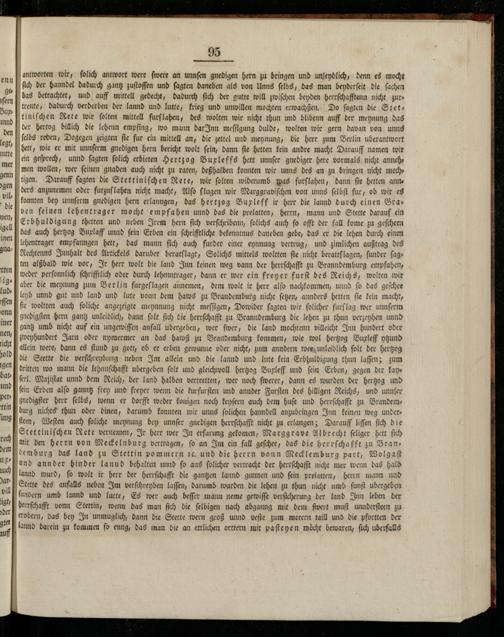 dritten wo mann die lehnnſchafft ubergeben ſolt und gleichwoll hertzoag Buxleff und fein Erben, gegen der kay= ſerl. Maſiſtat unnd dem Reich, der land halben vertretten, wer noch ſwerer, dann es wurden der hertzog und fein Erben alſo ganntz frey und freyer wenn die kurfurſten und annder Furſten des hilligen Reichs, und unnſer gnedigſter herr ſelbs, wenn er dorfft weder konigen noch keyſern auch dem huſe und herrſchafft zu Brandemburg nichts thun oder dinen, darumb konnten wir unns ſolichen hanndell anzubringen Inn keinen weg under— ſtenn, Weſten auch ſoliche meynung bey unnſer gnedigen herrſchafft nicht zu erlangen; Darauff liſſen ſich die Stettiniſchen Rete vernemen, Ir herr wer In erfarung gekomen, Marggrave Albrecht ſeliger hett ſich