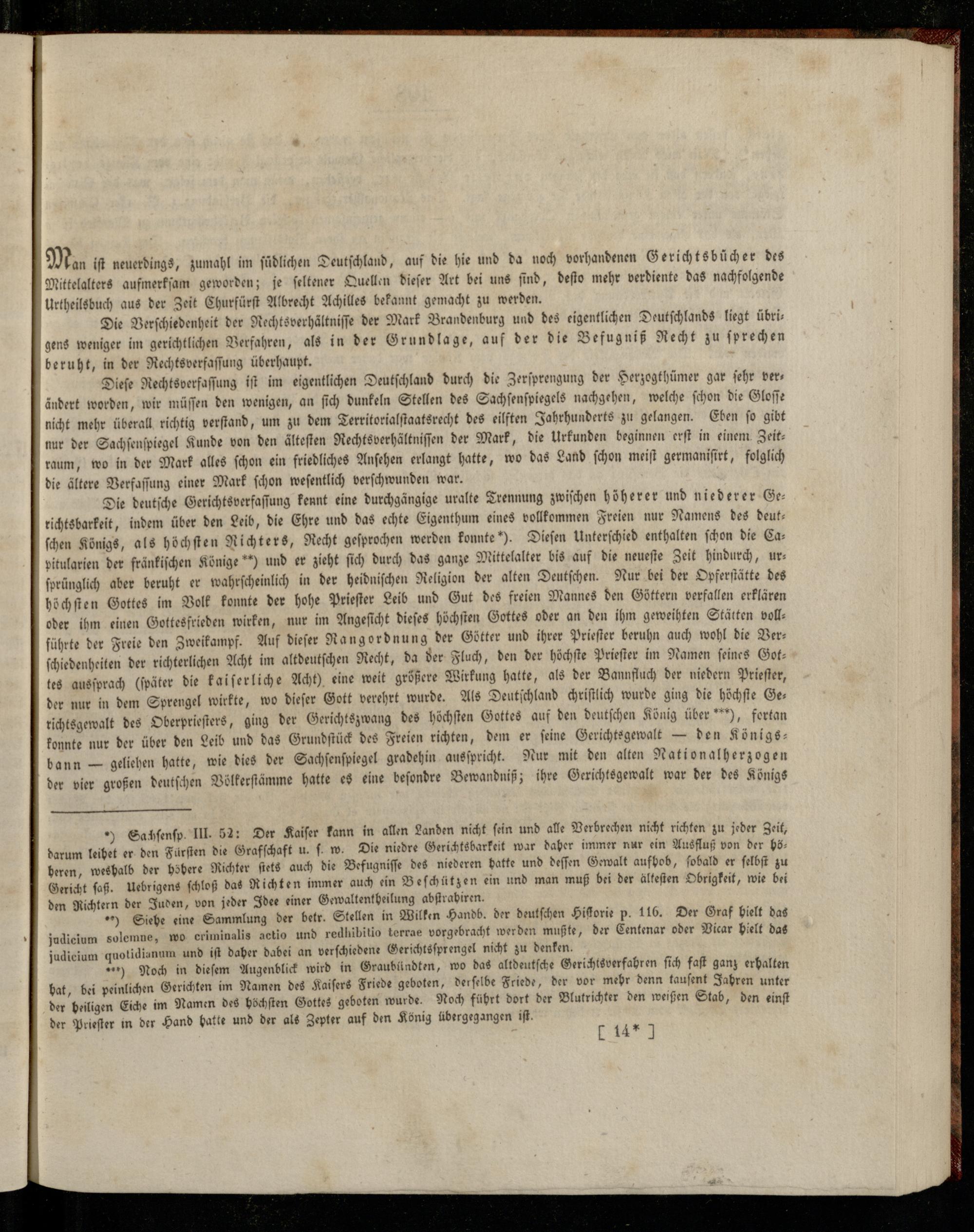 Die deutſche Gerichtsverfaſſung kennt eine durchgängige uralte Trennung zwiſchen höherer und niederer Ge: richtsbarkeit, indem über den Leib, die Ehre und das echte Eigenthum eines vollkommen Freien nur Namens des deut— ſchen Königs, als höchſten Richters, Recht geſprochen werden konnte). Dieſen Unterſchied enthalten ſchon die Ca: pitularien der fränkiſchen Könige**) und er zieht ſich durch das ganze Mittelalter bis auf die neueſte Zeit hindurch, ur— ſprünglich aber beruht er wahrſcheinlich in der heidniſchen Religion der alten Deutſchen. Nur bei der Opferſtätte des höchſten Gottes im Volk konnte der hohe Prieſter Leib und Gut des freien Mannes den Göttern verfallen erklären oder ihm einen Gottesfrieden wirken, nur im Angeſicht dieſes höchſten Gottes oder an den ihm geweihten Stätten voll: führte der Freie den Zweikampf. Auf dieſer Rangordnung der Götter und ihrer Prieſter beruhn auch wohl die Verſchiedenheiten der richterlichen Acht im altdeutſchen Recht, da der Fluch, den der höchſte Prieſter im Namen feines Gottes ausſprach(ſpäter die kaiſerliche Acht) eine weit größere Wirkung hatte, als der Bannfluch der niedern Prieſter, der nur in dem Sprengel wirkte, wo dieſer Gott verehrt wurde. Als Deutſchland chriſtlich wurde ging die höchſte Ge— richtsgewalt des Oberprieſters, ging der Gerichtszwang des höchſten Gottes auf den deutſchen König über“), fortan konnte nur der über den Leib und das Grundſtück des Freien richten, dem er feine Gerichtsgewalt— den Königs: bann— geliehen hatte, wie dies der Sachſenſpiegel gradehin ausſpricht. Nur mit den alten Nationalherzogen der vier großen deutſchen Völkerſtämme hatte es eine beſondre Bewandniß; ihre Gerichtsgewalt war der des Königs
