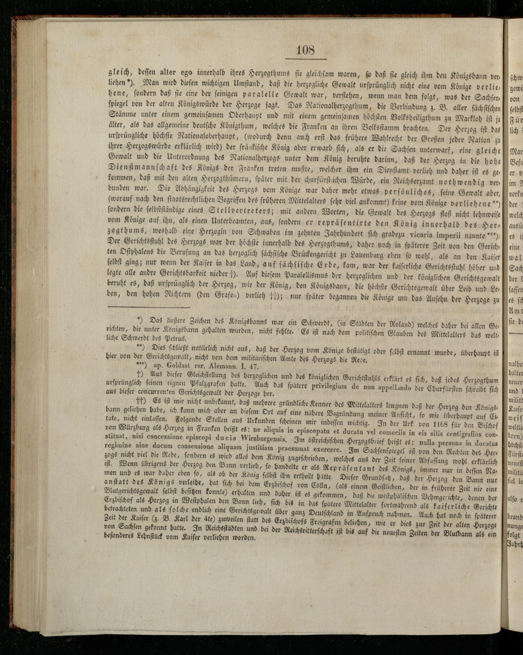gleich, deſſen alter ego innerhalb ihres Herzogthums ſie gleichſam waren, fo daß fie gleich ihm den Königsbann ver: liehen). Man wird dieſen wichtigen Umſtand, daß die herzogliche Gewalt urſprünglich nicht eine vom Könige verlie—hene, ſondern daß ſie eine der ſeinigen paralelle Gewalt war, verſtehen, wenn man dem folgt, was der Sachſen— ſpiegel von der alten Königswürde der Herzoge ſagt. Das Nationalherzogthum, die Verbindung z. B. aller ſäch ſiſchen Stämme unter einem gemeinſamen Oberhaupt und mit einem gemeinſamen höchen Volksheiligthum zu Markloh iſt ja älter, als das allgemeine deutſche Königthum, welches die Franken an ihren Volksſtamm brachten. Der Herzog iſt das urſprüngliche höchſte Nationaloberhaupt,(wodurch denn auch erſt das frühere Wahlrecht der Großen jeder Nation u ihrer Herzogswürde erklärlich wird) der fränkiſche König aber erwarb ſich, als er die Sachſen unterwarf, eine gleiche Gewalt und die Unterordnung des Nationalherzogs unter dem König beruhte darinn, daß der Herzog in die hohe Dienſtmannſchaft des Königs der Franken treten mußte, welcher ihm ein Dienſtamt verlieh und daher iſt es gekommen, daß mit den alten Herzogthümern, ſpäter mit der churfürſt ichen Würde, ein Reichserzamt nothwendig ver— bunden war. Die Abhängigkeit des Herzogs vom Könige war daher mehr etwas perſönliches, ſeine Gewalt aber, (worauf nach den ſtaatsrechtlichen Begriffen des früheren Mittelalters ſehr viel ankommt) keine vom Könige verliehene**) ſondern die ſelbſtſtändige eines Stellvertreters; mit andern Worten, die Gewalt des Herzogs floß nicht lehnweiſe vom Könige auf ihn, als einen Unterbeamten, aus, ſondern er repräſentirte den König innerhalb des Herzogthums, weshalb eine Herzogin von Schwaben im zehnten Jahrhundert ſich gradezu vicaria imperii nannte***): Der Gerichtsſtuhl des Herzogs war der höchſte innerhalb des Herzogthums, daher noch in ſpäterer Zeit von den Gerich— ten Oſtphalens die Berufung an das herzoglich ſächſiſche Brückengericht zu Lauenburg eben ſo wohl, als an den Kaiſer