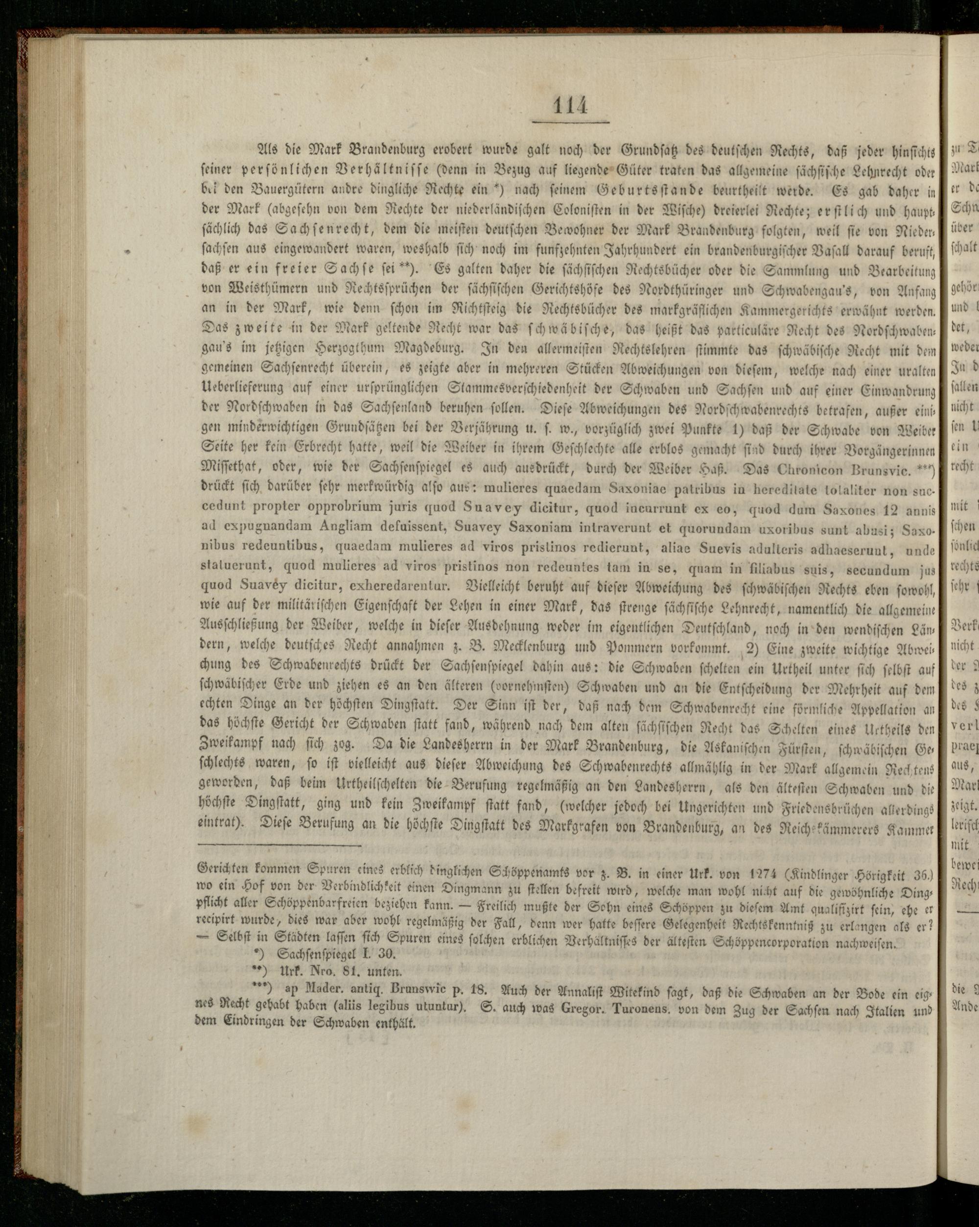 Als die Mark Brandenburg erobert wurde galt noch der Grundſatz des deutſchen Rechts, daß jeder hinfichts feiner perſönlichen Verhältniſſe(denn in Bezug auf liegende Güter traten das allgemeine ſächſiſche Lehnrecht oder bei den Bauergütern andre dingliche Rechte ein) nach feinem Geburtsſtande beurtheilt werde. Es gab daher in der Mark(abgeſehn von dem Rechte der niederländiſchen Coloniſten in der Wiſche) dreierlei Rechte; er ſt lich und haupt ſächlich das Sachſenrecht, dem die meiſten deutſchen Bewohner der Mark Brandenbt är folgten, weil fie von Nieder ſachſen aus eingewandert waren, weshalb ſich noch im funfzehnten Jahrhundert ein brandenb uegicch Vaſall darauf beruft, daß er ein freier Sachſe ſei*). Es galten daher die ſächſiſchen Rechtsbücher oder die 2 Ohm und Bearbeitung von Weisthümern und we, eulen der ſäc dir e per en ee. des Nordthüringer und Schwabengau's, von Anfang De ite i. ſchwäbiſche, das heißt das particuläre Recht des No gau's im jetzigen& hum Magdeburg. In den ermeiſten Rechtslehren ſtimmte das ſchwäbiſche Recht mit dem gemeinen er, ,. übe rein, es zeigte aber in mehreren Stücken Abweichungen von dieſem, welche nach einer uralten Ueberlieferung auf einer urſprünglichen Stammesverſchiedenheit der Schwaben und Sachſen und auf einer Einwandrung