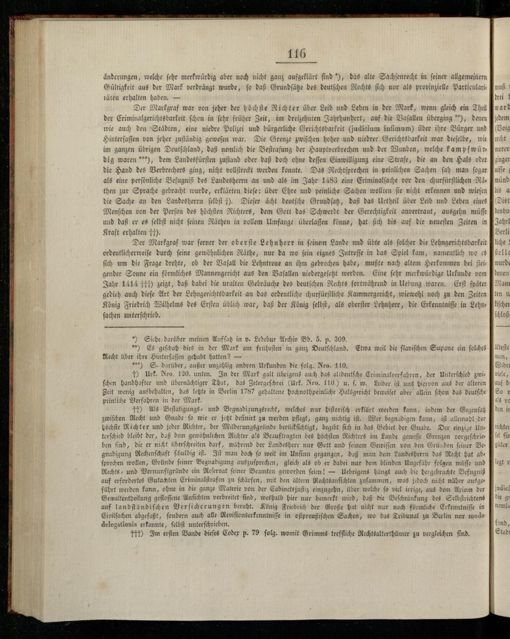 *) Urk. Nro. 120. unten. In der Mark galt übrigens auch das alideutſche Criminalverfahren, der Unterſchied zwi ſchen handhafter und übernächtiger That, das Zetergeſchrei(Urk. Nro. 110.) u. ſ. w. Leider iſt uns hiervon aus der alteren Zeit wenig aufbehalten, das letzte in Berlin 1787 gehaltene hochnothpeinliche Halsgericht beweiſet aber allein ſchon das deutſche peinliche Verfahren in der Mark.