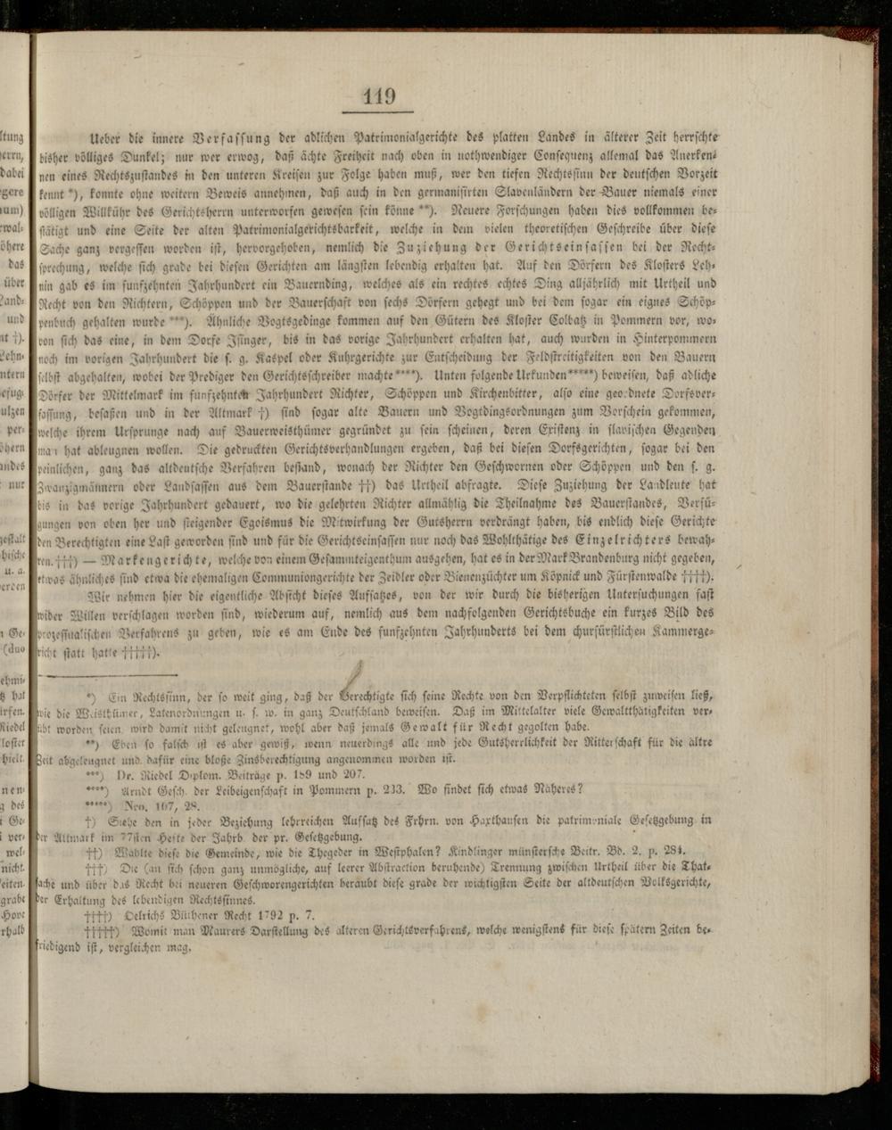 Ueber die innere Verfassung der adlichen Patrimonialgerichte des platten Landes in älterer Zeit herrschte bisher völliges Dunkel; nur wer erwog, daß ächte Freiheit nach oben in nothwendiger Consequenz allemal das Anerkend nen eines Rechtszustandes in den unteren Kreisen zur Folge haben muß, wer den tiefen Nechtssinn der deutschen Vorzeit fennt), fonnte ohne weitern Beweis annehmen, daß auch in den germanisirten Slavenländern der Bauer niemals einer völligen Willkühr des Gerichtsherrn unterworfen gewesen sein könne**). Neuere Forschungen haben dies vollkommen be ftätigt und eine Seite der alten Patrimonialgerichtsbarkeit, welche in dem vielen theoretischen Geschreibe über diese Sache ganz vergessen worden ist, hervorgehoben, nemlich die Zuziehung der Gerichtseinsassen bei der Rechtsprechung, welche sich grade bei diesen Gerichten am längsten lebendig erhalten hat. Auf den Dörfern des Klosters Lehnin gab es im funfzehnten Jahrhundert ein Bauernding, welches als ein rechtes echtes Ding alljährlich mit Urtheil und Recht von den Richtern, Schöppen und der Bauerschaft von sechs Dörfern gehegt und bei dem sogar ein eignes Schöppenbuch gehalten wurde***). Ähnliche Vogtsgedinge kommen auf den Gütern des Kloster Colbat in Pommern vor, wo von sich das eine, in dem Dorfe Jinger, bis in das vorige Jahrhundert erhalten hat, auch wurden in Hinterpommern noch im vorigen Jahrhundert die s. g. Kaspel oder Kuhrgerichte zur Entscheidung der Feldstreitigkeiten von den Bauern felbst abgehalten, wobei der Prediger den Gerichtsschreiber machte****). Unten folgende Urkunden*****) beweisen, daß adliche Dörfer der Mittelmark im funfzehnten Jahrhundert Richter, Schöppen und Kirchenbitter, also eine geo: dnete Dorfsver fassung, besaßen und in der Altmark †) sind sogar alte Bauern und Vogtdingsordnungen zum Verschein gekommen, welche ihrem Ursprunge nach auf Bauerweisthümer gegründet zu sein scheinen, deren Eristenz in slavischen Gegenden man hat ableugnen wollen. Die gedruckten Gerichtsverhandlungen ergeben, daß bei diesen Dorfsgerichten, sogar bei den peinlichen, ganz das altdeutsche Verfahren bestand, wonach der Richter den Geschwornen oder Schöppen und den s. g. 3wanzigmännern oder Landsassen aus dem Bauerstande t) das Urtheil abfragte. Diese Zuziehung der Landleute hat bis in das vorige Jahrhundert gedauert, wo die gelehrten Nichter allmählig die Theilnahme des Bauerstandes, Verfü gungen von oben her und steigender Egoismus die Mitwirkung der Gutsherrn verdrängt haben, bis endlich diese Gerichte den Berechtigten eine Last geworden sind und für die Gerichtseinsassen nur noch das Wohlthätige des Einzelrichters bewahren.++)- Marfengerichte, welche von einem Gesammteigenthum ausgehen, hat es in der Mark Brandenburg nicht gegeben, etwas ähnliches sind etwa die ehemaligen Communiongerichte der Zeidler oder Bienenzüchter um Köpnick und Fürstenwalde tttt). Wir nehmen hier die eigentliche Absicht dieses Aufsatzes, von der wir durch die bisherigen Untersuchungen fast wider Willen verschlagen worden sind, wiederum auf, nemlich aus dem nachfolgenden Gerichtsbuche ein kurzes Bild des prozessualischen Verfahrens zu geben, wie es am Ende des funfzehnten Jahrhunderts bei dem churfürstlichen Kammerges richt statt hatte it).