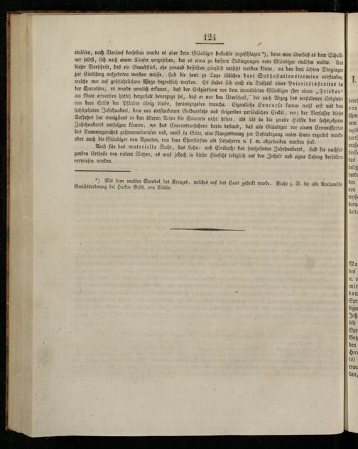 einlöſen, nach Verlauf derfelben wurde es aber dem Gläubiger definitiv zugeſchlagen N, denn man überließ es dem Schuldner ſelbſt, ſich nach einem Käufer umzuſehen, der es etwa zu beſſern Bedingungen vom Gläubiger einlöſen wollte. Aus dieſer Vorſchrift, daß ein Grundſtück, ehe jemand deſſelben gänzlich entſetzt werden könne, an den drei ächten Dingtagen zur Einlöſung aufgeboten werden müſſe, ſind die heut zu Tage üblichen drei Subhaſtationstermine entſtanden, welche nur auf geſchichtlichem Wege begreiflich werden. Es findet ſich auch ein Beiſpiel eines Prioritäts ſtreites bei der Execution; es wurde nemlich erkannt, daß der Erbzinsherr vor dem immittirten Gläubiger(der einen„Frieden“ am Gute erworben hatte) dergeſtalt bevorzugt ſei, daß er nur den lÜberſchuß, der nach Abzug des verfallenen Erbzinſes von dem Erlös der Pfänder übrig bleibe, herauszugeben brauche. Eigentliche Concurſe kamen wohl erſt mit dem ſechszehnten Jahrhundert, dem neu entſtandenen Geldverkehr und ſteigenden perſönlichen Credit, vor; der Verfaſſer dieſes Aufſatzes hat wenigſtens in den älteren Acten die Concurſe nicht höher, als bis in die zweite Hälfte des ſechszehnten Jahrhunderts verfolgen können, wo das Concursverfahren darin beſtand, daß alle Gläubiger vor einem Commiſſarius des Kammergerichts zuſammenberufen und, meiſt in Güte, eine Rangordnung zur Befriedigung unter ihnen regulirt wurde oder auch die Gläubiger von Agnaten, von dem Churfürſten als Lehnherrn u. ſ. w. abgefunden worden ſind.