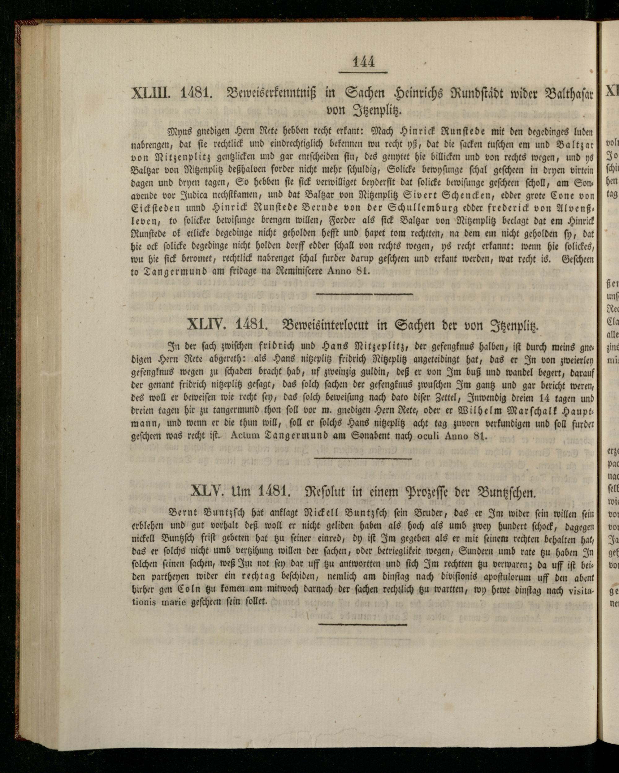 Myns gnedigen Hern Rete hebben recht erkant: Mach Hinrick Runſtede mit den degedinges luden nabrengen, dat fie rechtlick und eindrechtiglich bekennen wu recht yß, dat die ſacken tuſchen em und Baltzar von Nitzenplitz gentzlicken und gar entſcheiden ſin, des genytet hie billicken und von rechts wegen, und ys Baltzar von Nitzenplitz deßhalven forder nicht mehr ſchuldig, Solicke bewyſunge ſchal geſcheen in dryen virtein dagen und dryen tagen, So hebben fie fick verwilliget beyderſit dat ſolicke bewiſunge geſcheen ſcholl, am Son avende vor Judica nechſtkamen, und dat Baltzar von Nitzenplitz Sivert Schencken, edder grote Cone von Eickſteden unnd Hinrick Runſtede Bernde von der Schullemburg edder frederick von Alvenß— leven, to ſolicker bewiſunge brengen willen, Forder als ſick Baltzar von Nitzenplitz beclagt dat em Hinrick Runſtede ok etlicke degedinge nicht geholden hefft und hapet tom rechtten, na dem em nicht geholden ſy, dat hie ock ſolicke degedinge nicht holden dorff edder ſchall von rechts wegen, ys recht erkannt: wenn hie ſolickes, wu hie fick beromet, rechtlick nabrenget ſchal furder darup geſcheen und erkant werden, wat recht is. Geſcheen to Tangermund am fridage na Reminiſcere Anno 81.