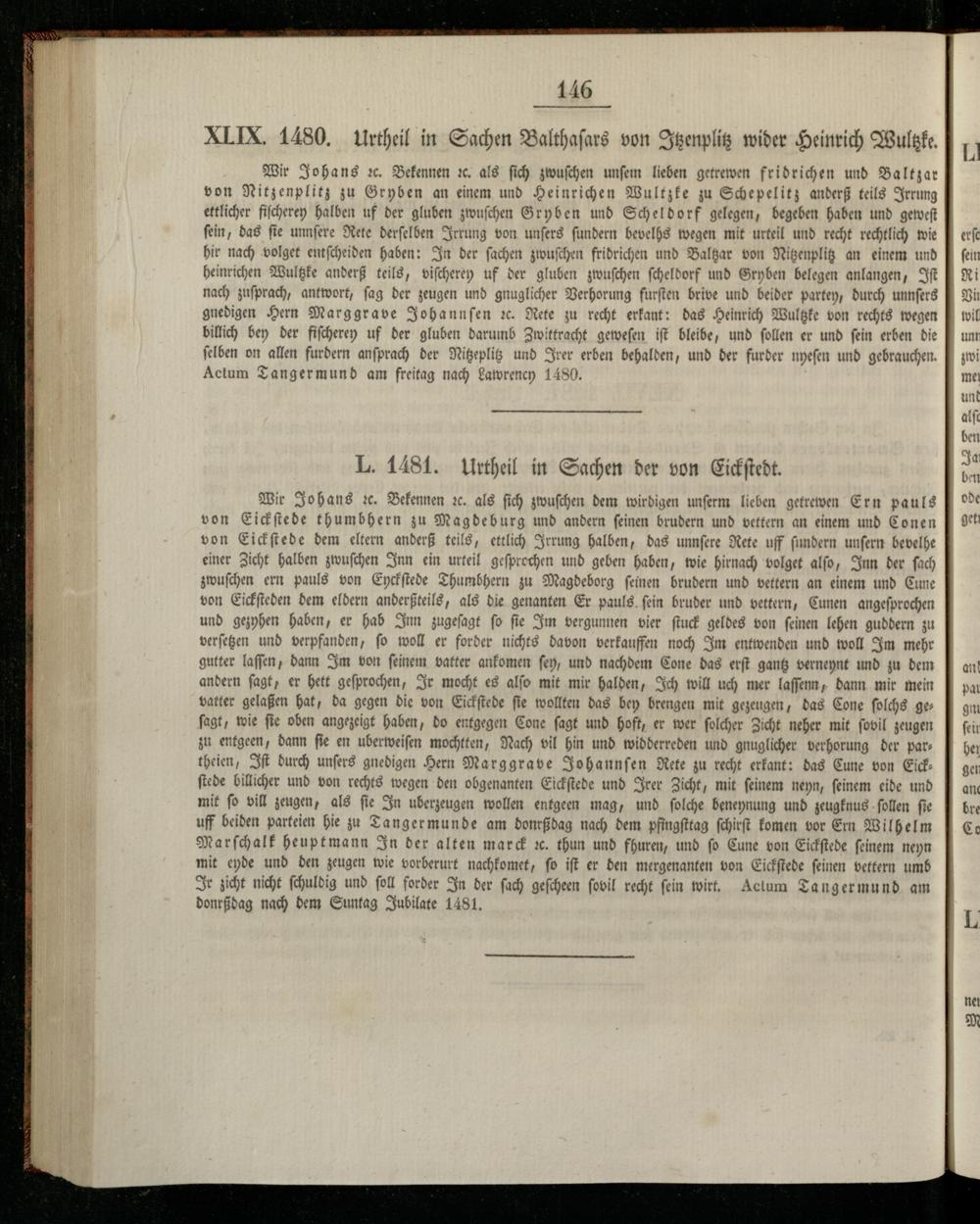 146 XLIX. 1480. Urtheil in Sachen Balthaſars von Itzenplitz wider Heinrich Wultzke.