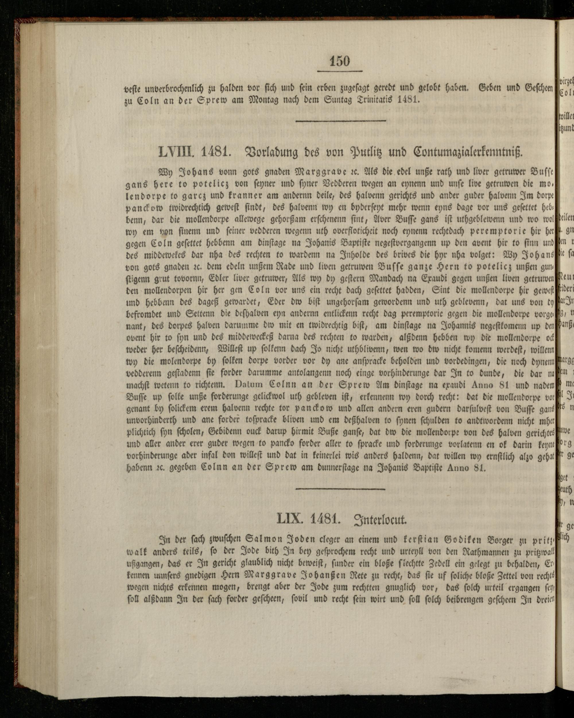 In der ſach zwuſchen Salmon Joden cleger an einem und kerſtian Godiken Borger zu pritzwalk anders teils, fo der Jode bith In bey geſprochem recht und urteyll von den Rathmannen zu pritz wal ußgangen, das er In gericht glaublich nicht beweiſt, ſunder ein bloße ſlechtte Zedell ein gelegt zu behalden, Er kennen unnſers gnedigen Hern Marggrave Johanßen Rete zu recht, das fie uf ſoliche bloße Zettel von recht́ wegen nichts erkennen mogen, brengt aber der Jode zum rechtten gnuglich vor, das ſolch urteil ergangen ſey ſoll alßdann In der fach forder geſcheen, ſovil und recht fein wirt und ſoll ſolch beibrengen geſcheen In dreien