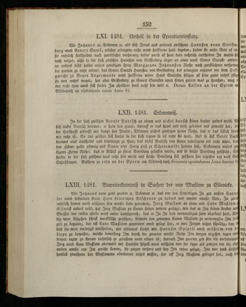 Wir Johanns ꝛc. Bekennen 20. als ſich Irnus und zwitrach zwiſchen Hannßen vonn Greifen: berg unnd Gevert Sunik, etlicher erlangten recht unnd hulfbrive halb begeben, haben ſie unſer Rete uf un fer rechtlich furſcheiden nach gunstlicher vorhorung beider parth uf heut dato rechtlich entſcheiden In maſen hir nach volget, alßo in der fach zwiſchen Hannßen von Griffenberg cleger an einen unnd Gevert Sunicke antwor, ter anders teils haben unſers genedigen Hern Marggrave Johannßen Rethe nach gunſtlichenn verhorung der partien zu recht erkant: das Gevert Sunicke Hannßen von Greifenberg des erlangten rechtens vor dem Hoff gericht zu Neyen Angermunde unnd hulfbrive wider Hans Sunicken ſeligen uf feine guter nichts pflege ſy von rechts wegen, hat aber Griffenberg zu Gevert Sunicken unnd ſeinen gutern was zu ſprechen, mag er mit recht thun unnd ſoll forder Im gheſcheen ſovil recht fein wirt ꝛc. Datum Collnn an der Sprew am Middewoch na visitalionis marie Anno 81.