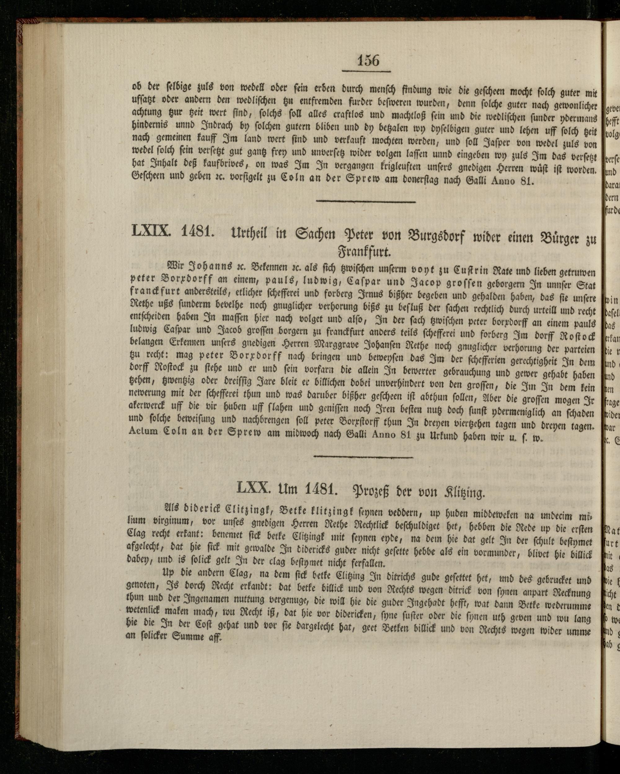 Wir Johanns c. Bekennen ꝛc. als ſich tzwiſchen unſerm voyt zu Cuſtrin Rate und lieben getruwen peter Borxdorff an einem, pauls, ludwig, Caſpar und Jacop groſſen geborgern In unnſer Stat franck furt andersteils, etlicher ſchefferei und forberg Irnus bißher begeben und gehalden haben, das ſie unſere Rethe ußs ſunderm bevelhe noch gnuglicher verhorung bißs zu beſluß der ſachen rechtlich durch urteill und recht entſcheiden haben In maſſen hier nach volget und alſo, In der ſach tzwiſchen peter borxdorff an einem pauls ludwig Caſpar und Jacob groſſen borgern zu franckfurt anders teils ſchefferei und forberg Im dorff Roſtock belangen Erkennen unſers gnedigen Herren Marggrave Johanſen Rethe noch gnuglicher verhorung der parteien tzu recht: mag peter Borxdorff nach bringen und beweyſen das Im der ſchefferien gerechtigheit In dem dorff Roſtock zu ſtehe und er und ſein vorfarn die allein In bewerter gebrauchung und gewer gehabt haben tzehen, tzwentzig oder dreiſſig Jare bleit er billichen dobei unverhindert von den groſſen, die In In dem kein newerung mit der ſchefferei thun und was daruber bißher geſcheen iſt abthun ſollen, Aber die groſſen mogen Ir akerwerck uff die vir huben uff ſlahen und geniſſen noch Iren beſten nutz doch ſunſt ydermeniglich an ſchaden und ſolche beweiſung und nachbrengen ſoll peter Borxſtorff thun In dreyen viertzehen tagen und dreyen tagen. Actum Coln an der Spremw am midwoch nach Galli Anno 81 zu Urkund haben wir u. ſ. w.