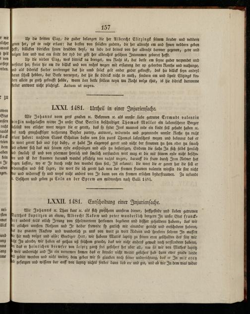 Wir Johanns vonn gots gnaden 20. Bekennen ꝛc. als unnſer liebe getruwe Ertmudt valentin dinßin nachgelaſſen witwe In unſer Stat Berlin beſchuldiget Thomas Moller ein lakennſcherer Borger bafelbft von etlicher wort wegen die er gerett, das ſy ſyder Ires mannes tode ein kindt ſoll gehabt haben ꝛc. 8 nach gnughafftiger verhorung Bender partey, antwort, widerrede und gegennrede unnſer Rethe tzu recht urlant haben: nachdem Claws Schultan daſtee von fein parts Thomas lakenſchers wegen und bekennet das er bie wort gerett hab und ſetzt daby, er habs In clagewys gerett und nicht der frouwen tzu hon oder tzu ſmach nd erbewt ſich das mit feinem ende außtzulegen und alſo Bu beſtettigen, Sodenn die ſache In ſich ſelbs honlich nd ſmelich iſt und von yderman honlich und ſmelich verſtanden wirt mag er die mit feinem eyde nicht beſchoken und iſt der frauwen darumb wandel pflichtig von rechts wegen, darauff die fraw durch Iren Redner hat tagen laſſen, wy er Ir durch recht den wandel thun ſoll, Iſt erkannt: die wort die er gerett hat die ſoll er biderruffen und ſoll ſagen, die wort die ich gerett hab von der fromen frauwen valentin winßin die ſint nicht bar und widerruff ſy und weys nicht anders von Ir dann von ein fromen erlichen byderfrauwen. Zu urkundt . Geſcheen und geben zu Coln an der Sprew am midwochen nach Galli 1481.