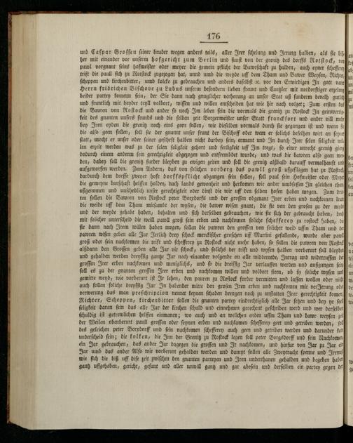 verwerung das man preſchripcion nennet keynen ſchaden brengen noch zu unſtatten Irer gerechtigkeit komen Richter, Scheppen, kirchenbitter ſollen die gnanten partey eindrechtiglich alle Jar ſetzen und bey yr ſeel ſeligkeit daran ſein das alle Jar der kirchen ſchuld und einnehmen gerechent geſchriben werb und wer derſelbel ſchuldig iſt getrewlichen helffen einnanen; wo auch und an welichen enden uffm Tham und bawr weyſen zei der Weilen obenberurt paull groſſen oder ſeynen erben und nachkamen ſchefferey geet und getriben werden, ſol des geleichen peter Borxdorff und ſein nachkomen ſchefferey auch geen und getriben werden und darunder kein underſcheid ſein; die kolken, die Inn der Grenitz zu Roſtock legen ſoll peter Borgsdorff und fein Nachkomen ein Jar gebrauchen, das ander Jar dagegen die groſſen und Ir nachkomen, und hinfur von Jar zu Jar ein Jar umb das ander Alſo wie vorberurt gehalden werden und damyt ſollen alle Zweytracht ſpenne und Irrmü wie ſich die biß uff diſe zeit zwiſchen den gnanten parteyen und Iren underthanen gehalden und begeben habe gantz uffgehaben, gericht, geſunt und aller unwill gantz und gar abeſein und derſelben ein partey gegen del
