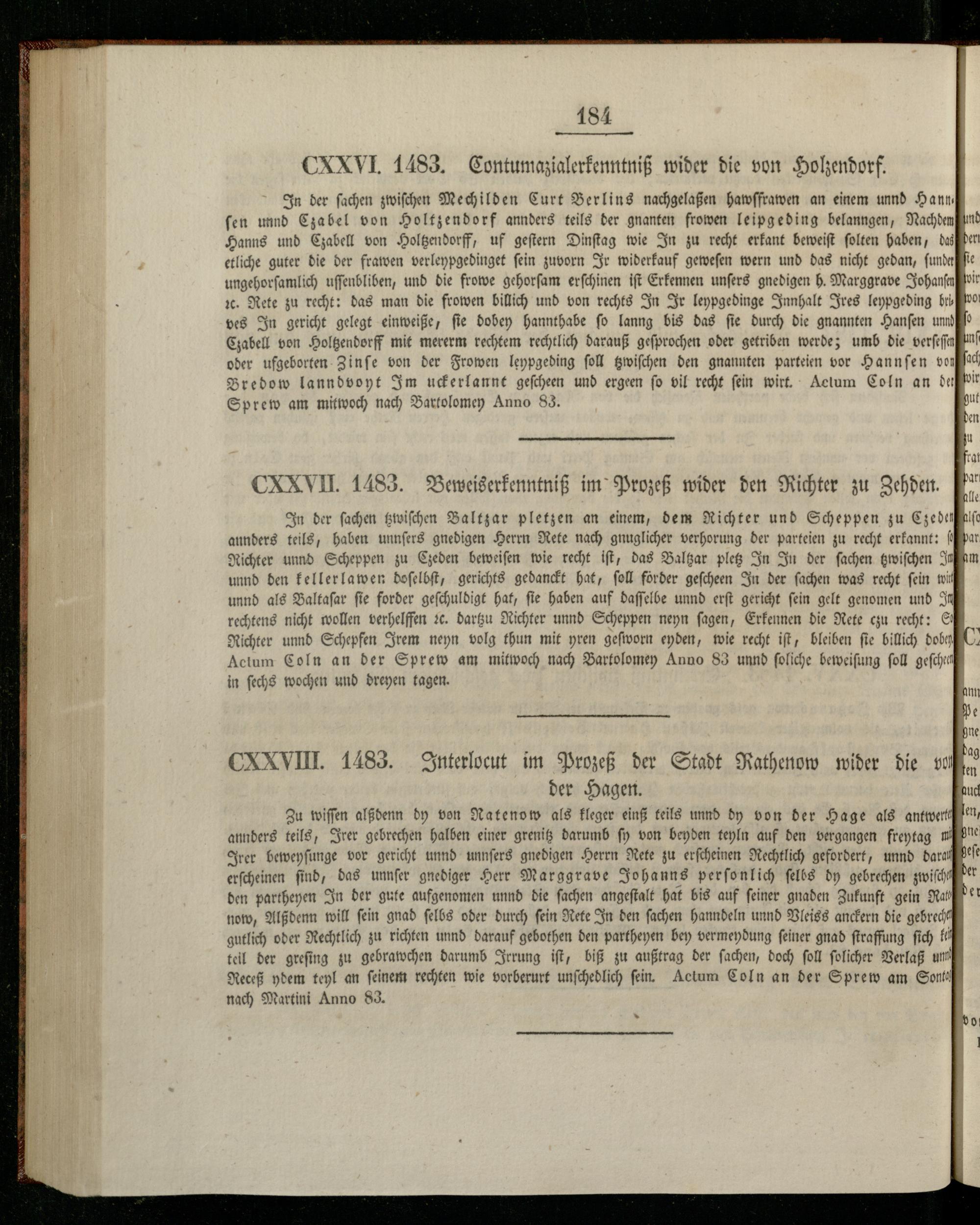 CXXVIII. 1483. Interlocut im Prozeß der Stadt Rathenow wider die vol der Hagen.