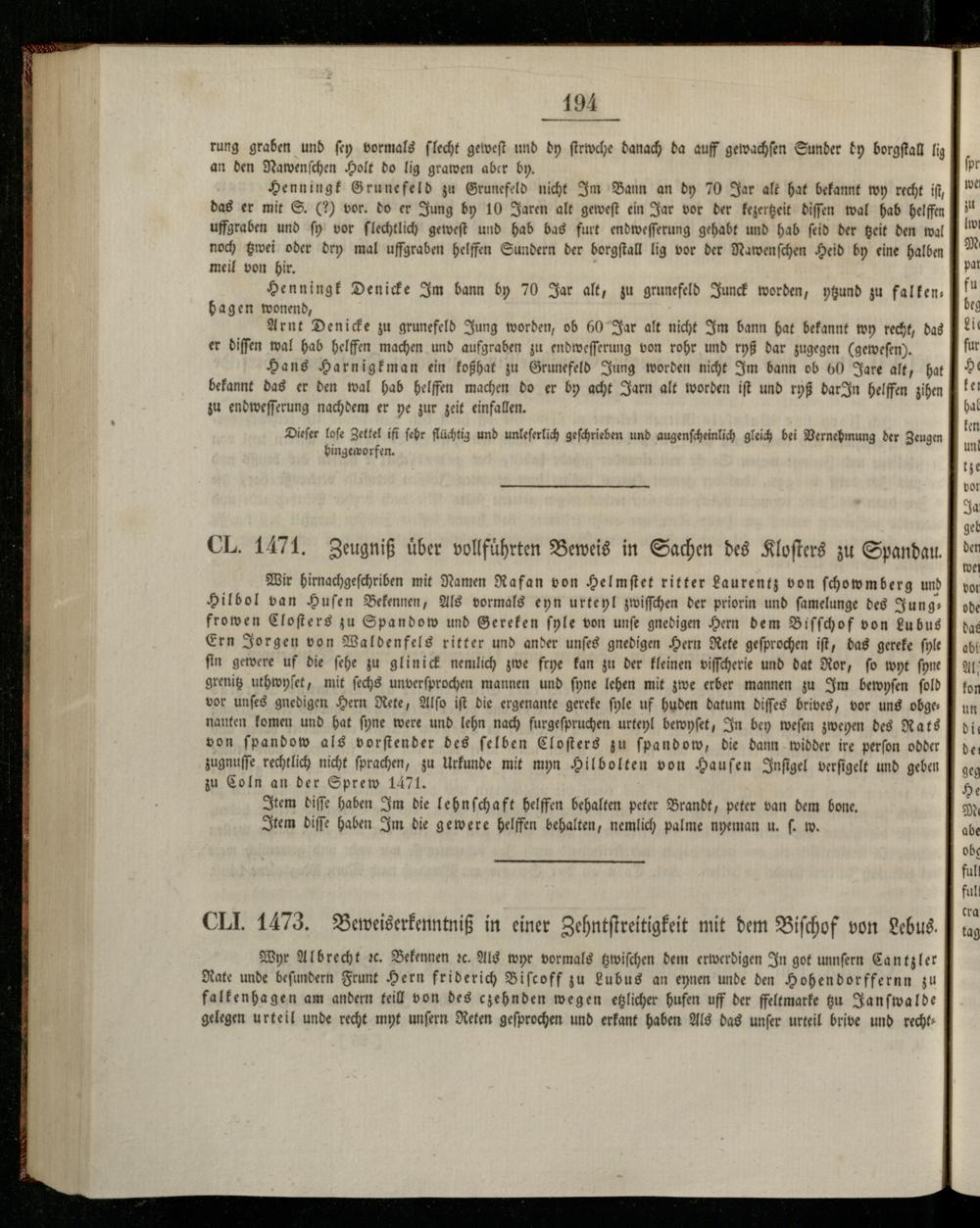 Wir hirnachgeſchriben mit Namen Rafan von Helmſtet ritter Laurentz von ſchowm berg und Hilbol van Hufen Bekennen, Als vormals eyn urte yl zwiſſchen der priorin und ſamelunge des Jungfrowen Eloſters zu Spandow und Gereken ſyle von unſe gnedigen Hern dem Biſſchof von Lu bus Ern Jorgen von Waldenfels ritter und ander unſes gnedigen Hern Rete geſprochen iſt, das gereke ſyle fin gewere uf die ſehe zu glinick nemlich zwe frye kan zu der kleinen viſſcherie und dat Nor, fo wyt ſyne grenitz uthwyſet, mit ſechs unverſprochen mannen und ſyne lehen mit zwe erber mannen zu Im bewyſen ſold vor unſes gnedigen Hern Rete, Alſo iſt die ergenante gereke ſyle uf huden datum diſſes brives, vor uns obge— nanten komen und hat ſyne were und lehn nach furgeſpruchen urteyl bewyſet, In bey weſen zweyen des Rats von ſpandow als vorſtender des ſelben Eloſters zu ſpandow, die dann widder ire perſon odder zugnuſſe rechtlich nicht ſprachen, zu Urkunde mit myn Hilbolten von Hauſen Inſigel verſigelt und geben zu Coln an der Sprew 1471.