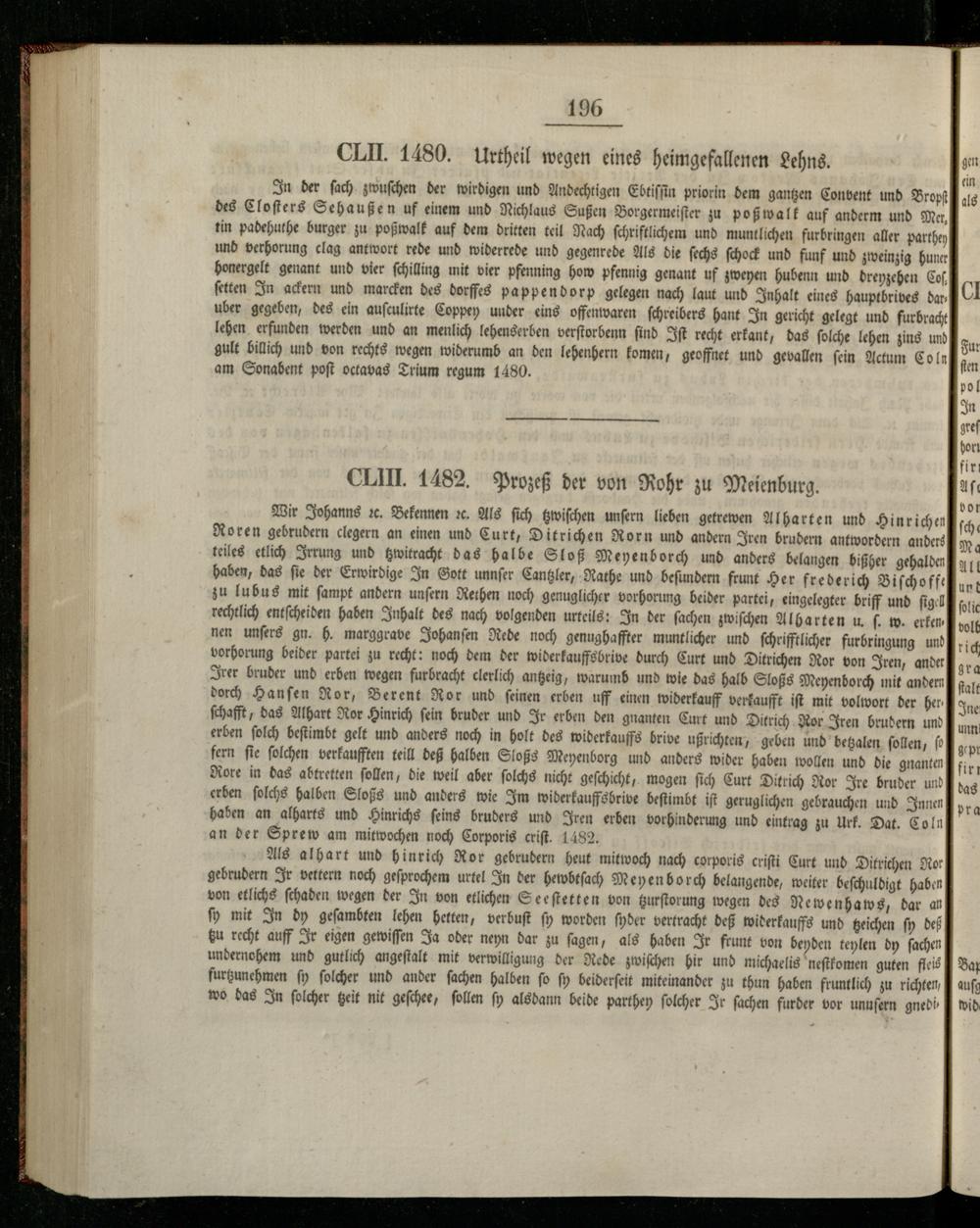 Wir Johanns ꝛc. Bekennen ꝛc. Als ſich tzwiſchen unſern lieben getrewen Alharten und Hinrichen Roren gebrudern clegern an einen und Curt, Ditrichen Rorn und andern Iren brudern antwordern anders teiles etlich Irrung und tzwitracht das halbe Sloß Meyenborch und anders belangen bißher gehalden haben, das ſie der Erwirdige In Gott unnſer Cantzler, Rathe und beſundern frunt Her frederich Biſchofft zu lubus mit ſampt andern unſern Reihen noch genuglicher vorhorung beider partei, eingelegter briff und ſigell rechtlich entſcheiden haben Inhalt des nach volgenden urteils: In der ſachen zwiſchen Alharten u. ſ. w. erkennen unſers gn. h. marggrave Johanſen Rebe noch genughaffter muntlicher und ſchrifftlicher furbringung und vorhorung beider partei zu recht: noch dem der widerkauffsbrive durch Curt und Ditrichen Ror von Iren, ander Irer bruder und erben wegen furbracht clerlich antzeig, warumb und wie das halb Sloßs Meyenborch mit andern dorch Hanſen Ror, Berent Ror und ſeinen erben uff einen widerkauff verkaufft iſt mit volwort der herſchafft, das Alhart Ror Hinrich ſein bruder und Ir erben den gnanten Curt und Ditrich Ror Iren brudern und erben ſolch beſtimbt gelt und anders noch in holt des widerkauffs brive ußrichten, geben und betzalen ſollen, ſp fern fie ſolchen verkaufften teill deß halben Sloßs Meyenborg und anders wider haben wollen und die gnanten Rore in das abtretten ſollen, die weil aber ſolchs nicht geſchicht, mogen ſich Curt Ditrich Ror Ire bruder und erben ſolchs halben Sloßs und anders wie Im widerkauffsbrive beſtimbt iſt geruglichen gebrauchen und Innen haben an alharts und Hinrichs ſeins bruders und Iren erben vorhinderung und eintrag zu Urk. Dat. Coln an der Sprew am mitwochen noch Corporis criſt. 1482.