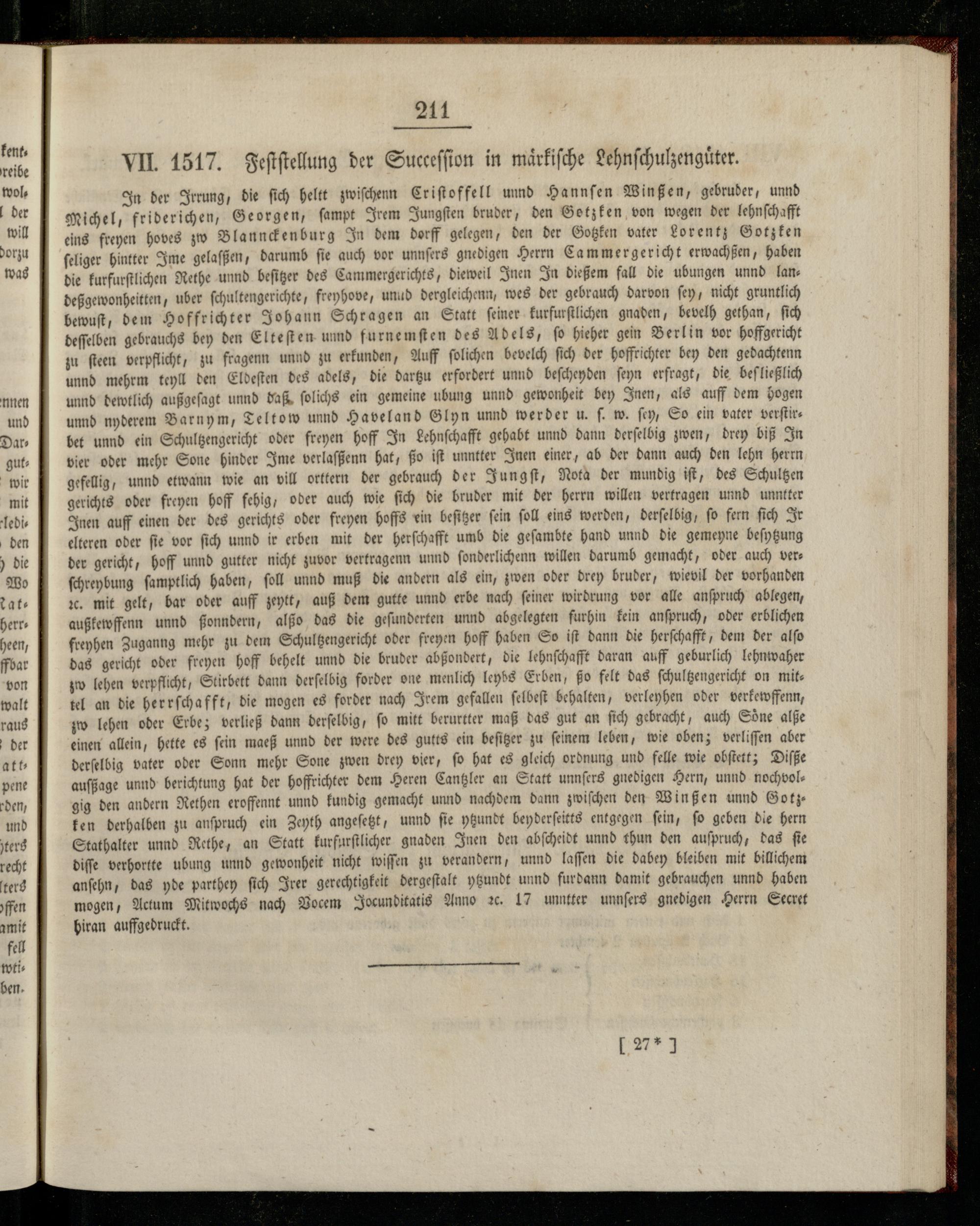 VII. 1517. Feſtſtellung der Succeſſion in maͤrkiſche Lehnſchulzenguͤter.