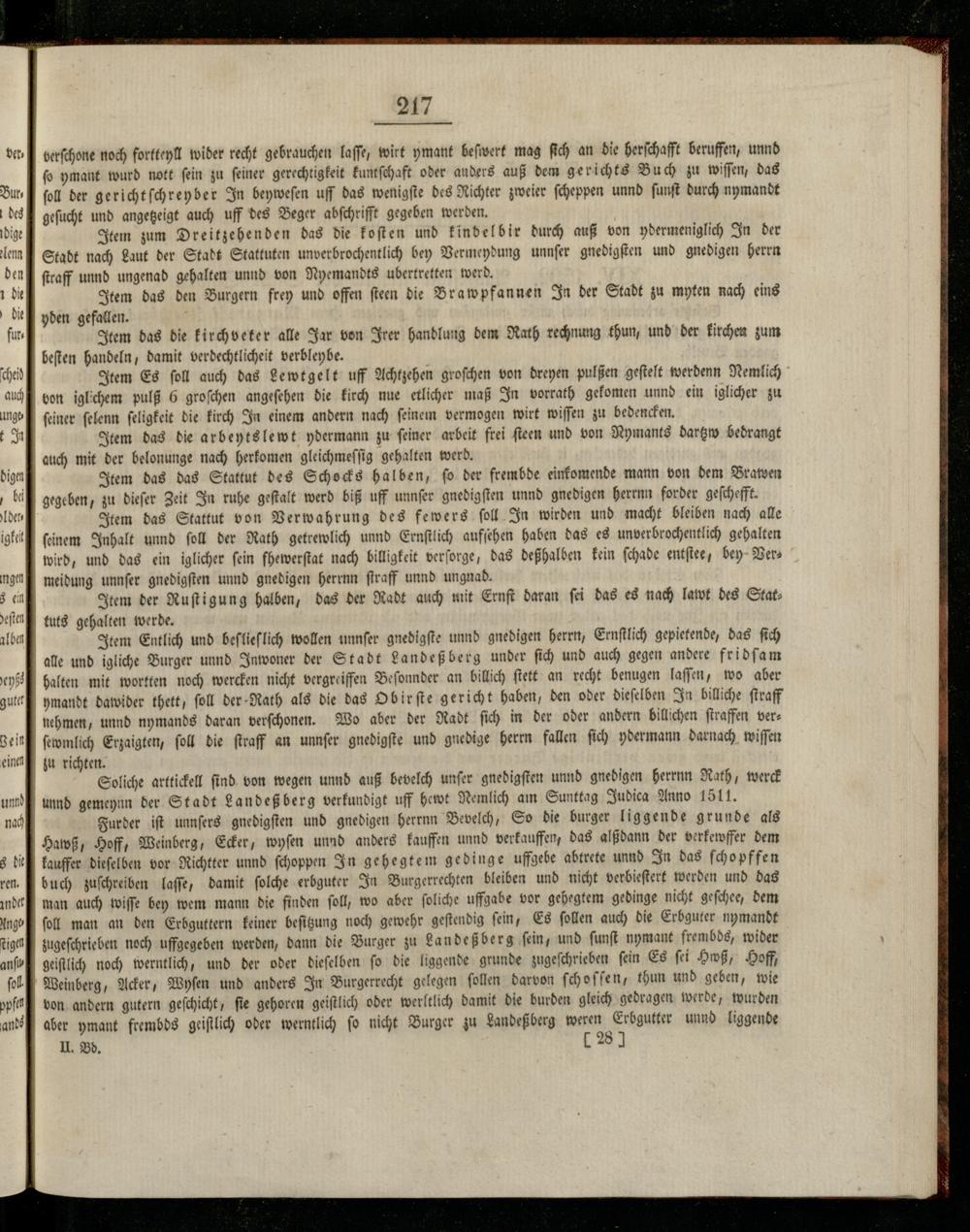 ymandt dawider thett, ſoll der Rath als die das Obir ſte gericht haben, den oder dieſelben In billiche ſtraff nehmen, unnd nymands daran verſchonen. Wo aber der Radt ſich in der oder andern billichen ſtraffen ver— ſewmlich Erzaigten, ſoll die ſtraff an unnſer gnedigſte und gnedige herrn fallen ſich ydermann darnach wiſſen zu richten. Soliche arttickell ſind von wegen unnd auß bevelch unſer gnedigſten unnd gnedigen herrnn Rath, werck unnd gemeynn der Stadt Landeß berg verkundigt uff hewt Nemlich am Sunttag Judica Anno 1511. Furder iſt unnſers gnedigſten und gnedigen herrnn Bevelch, So die burger liggende grunde als Hawß, Hoff, Weinberg, Ecker, wyſen unnd anders kauffen unnd verkauffen, das alßdann der verkewffer dem kauffer dieſelben vor Richtter unnd ſchoppen In gehegtem gedinge uffgebe abtrete unnd In das ſchopffen buch zuſchreiben laſſe, damit ſolche erbguter In Burgerrechten bleiben und nicht verbieſtert werden und das man auch wife bey wem mann die finden ſoll, wo aber ſoliche uffgabe vor gehegtem gedinge nicht geſchee, dem ſoll man an den Erbguttern keiner beſitzung noch gewehr geſtendig ſein, Es ſollen auch die Erbguter nymandt zugeſchrieben noch uffgegeben werden, dann die Burger zu Landeßberg ſein, und ſunſt nymant frembds, wider geiſtlich noch werntlich, und der oder dieſelben ſo die liggende grunde zugeſchrieben ſein Es ſei Hwß, Hoff, Weinberg, Acker, Wyſen und anders In Burgerrecht gelegen ſollen darvon ſchoſſen, thun und geben, wie von andern gutern geſchicht, ſie gehoren geiſtlich oder werltlich damit die burden gleich gedragen werde, wurden aber ymant frembds geiſtlich oder werntlich ſo nicht Burger zu Landeßberg weren Erbgutter unnd liggenbe