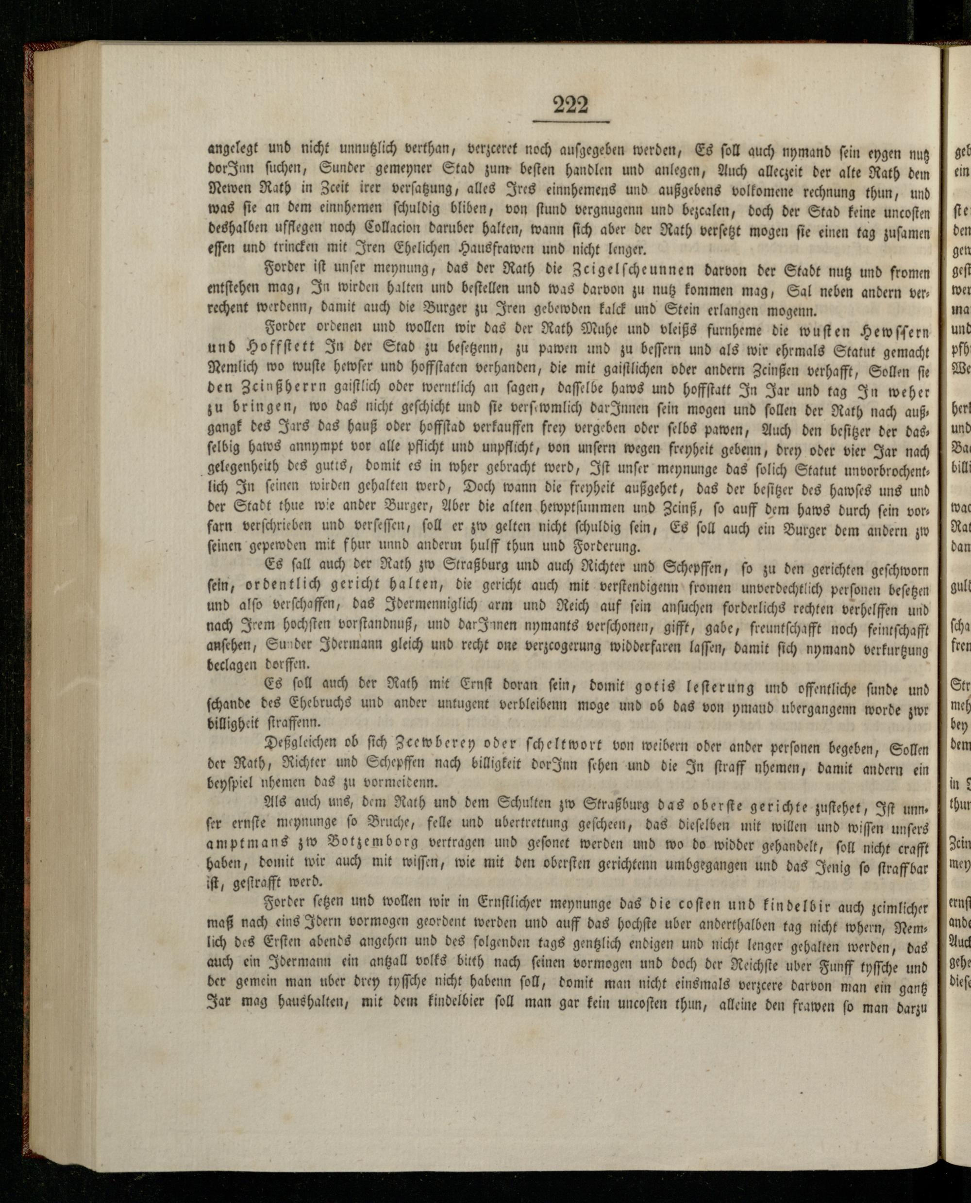 Es ſall auch der Rath zw Straßburg und auch Richter und Schepffen, ſo zu den gerichten geſchworn ſein, ordentlich gericht halten, die gericht auch mit verſtendigenn ſromen unverdechtlich perſonen beſetzen und alſo verſchaffen, das Idermenniglich arm und Reich auf ſein anſuchen forderlichs rechten verhelffen und nach Irem hochſten vorſtandnuß, und dar Innen nymants verſchonen, gifft, gabe, freuntſchafft noch feintſchafft anſehen, Sunder Idermann gleich und recht one verzcogerung widderfaren laſſen, damit ſich nymand verkurtzung beclagen dorffen.