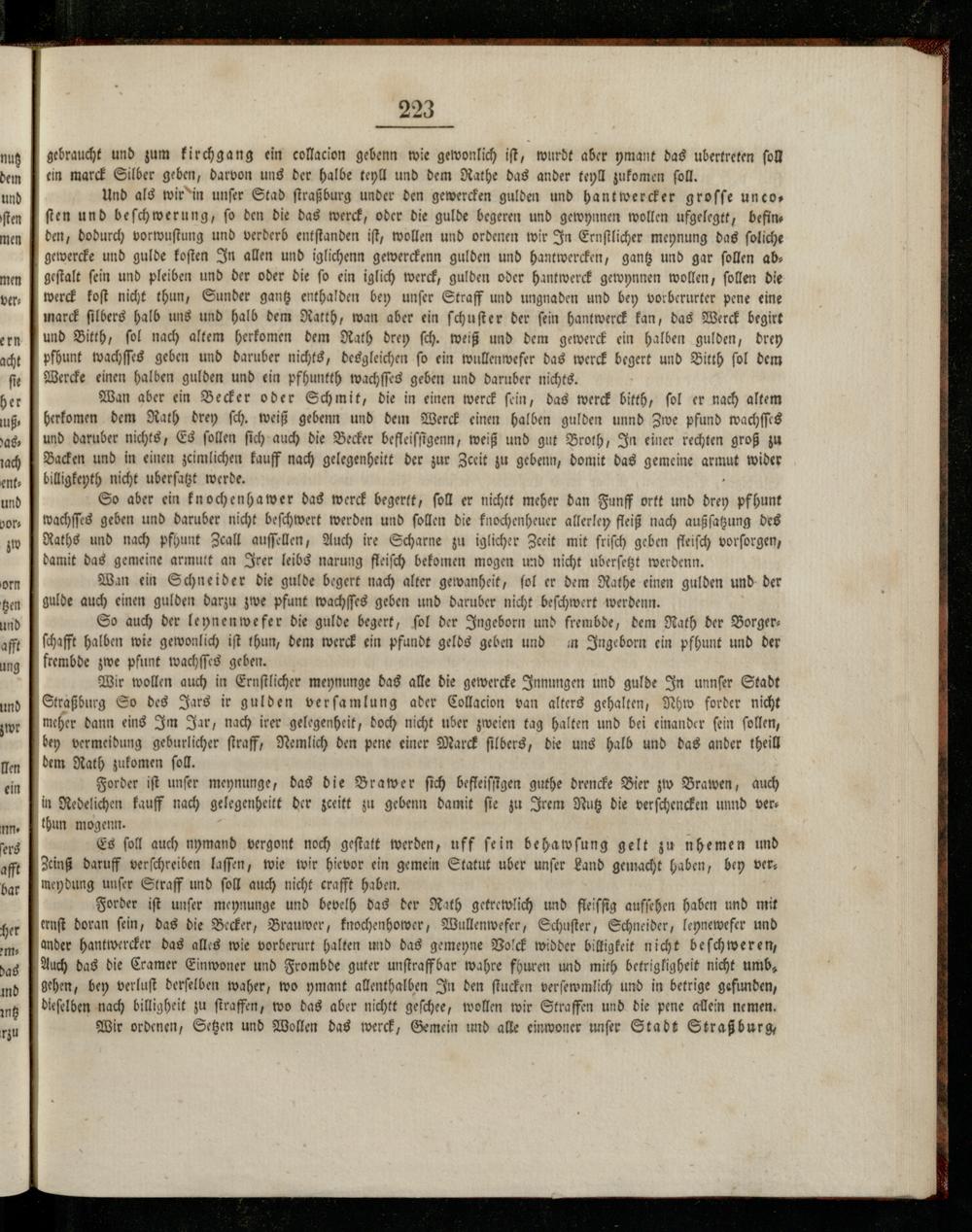 Wir wollen auch in Ernſtlicher meynunge das alle die gewercke Innungen und gulde In unnſer Stadt Straßburg So des Jars ir gulden verſamlung ader Collacion van alters gehalten, Nhw forder nicht meher dann eins Im Jar, nach irer gelegenheit, doch nicht uber zweien tag halten und bei einander ſein ſollen, bey vermeidung geburlicher ſtraff, Nemlich den pene einer Marck ſilbers, die uns halb und das ander theill dem Nath zukomen ſoll.
