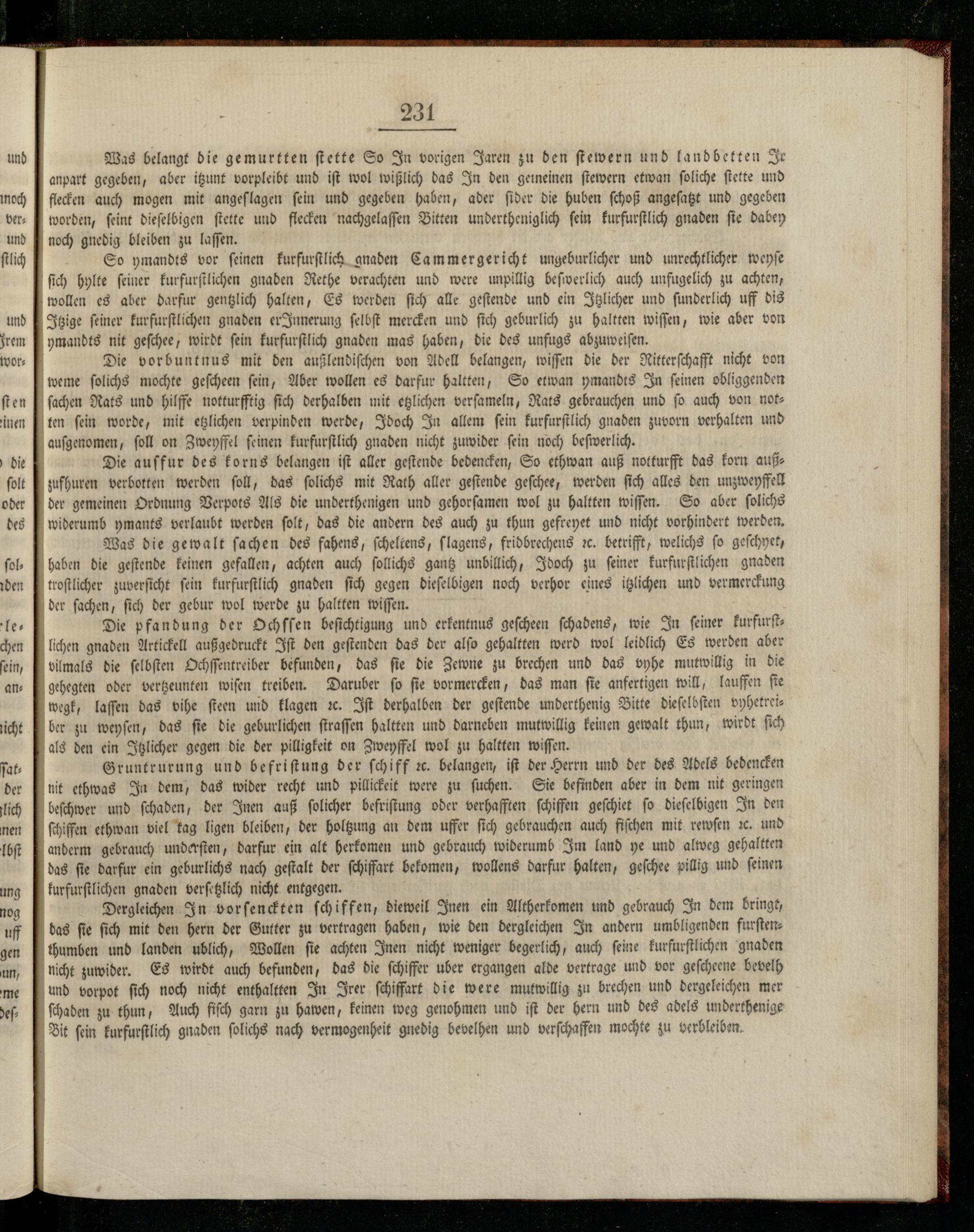 Dergleichen In vorſenckten ſchiffen, dieweil Inen ein Altherkomen und gebrauch In dem bringt, das ſie ſich mit den hern der Gutter zu vertragen haben, wie den dergleichen In andern umbligenden furſtenthumben und landen ublich, Wollen ſie achten Inen nicht weniger begerlich, auch ſeine kurfurſtlichen gnaden nicht zuwider. Es wirdt auch befunden, das die ſchiffer uber ergangen alde vertrage und vor geſcheene bevelh und vorpot ſich noch nicht enthalten In Irer ſchiffart die were mutwillig zu brechen und dergeleichen mer ſchaben zu thun, Auch fiſch garn zu hawen, keinen weg genohmen und iſt der hern und des adels underthenige Bit fein kurfurſtlich gnaden ſolichs nach vermogenheit gnedig bevelhen und verſchaffen mochte zu verbleiben.
