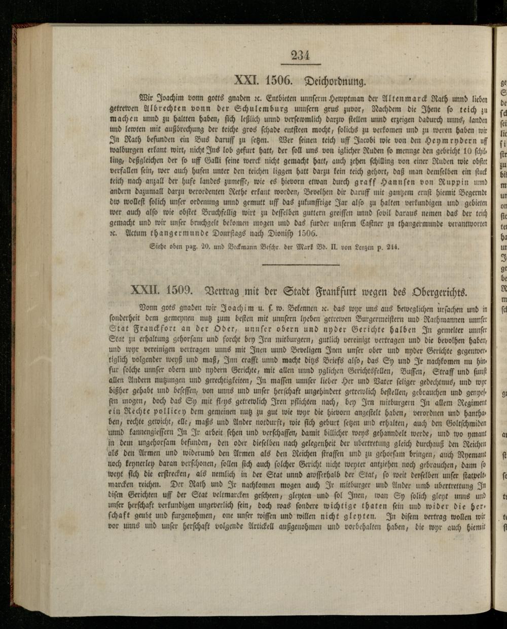 Wir Joachim bonn gotts gnaden ꝛc. Entbieten unnſerm Hewptman der Alten marck Rath unnd lieben getrewen Albrechten vonn der Schulemburg unnſern grus zuvor, Nachdem die Ihene ſo teich zu machen unnd zu haltten haben, ſich leßlich unnd verſewmlich darzw ſtellen unnd erzeigen dadurch unns, landen und lewten mit außbrechung der teiche gros ſchade entſteen mocht, ſolichs zu verkomen und zu weren haben wir In Rath befunden ein Bus daruff zu ſetzen. Wer feinen teich uff Jacobi wie von den Heym ꝛrydern uf walburgen erkant wirt, nicht Ins lob gefurt hatt, der ſoll uns von iglicher Ruden fo mennge den gebricht 10 ſchilling, deßgleichen der ſo uff Galli ſeine werck nicht gemacht hatt, auch zehen ſchilling von einer Ruden wie obſtet verfallen ſein, wer auch hufen unter den teichen liggen hatt darzu kein teich gehort, daß man demſelben ein ſtuck teich nach anzall der hufe landes zumeſſe, wie es hievorn etwan durch graff Hannſen von Ruppin unnd andern dazumall darzu verordenten Rethe erkant worden, Bevelhen dir daruff mit gantzem ernſt hiemit Begernde dw wolleſt ſolich unſer orbenung unnd gemutt uff das zukunfftige Jar alſo zu halten verkundigen und gebieten wer auch alſo wie obſtet Bruchfellig wirt zu deſſelben guttern greiffen unnd ſovil daraus nemen das der teich gemacht und wir unſer bruchgelt bekomen mogen und das furder unſerm Caſtner zu thangermunde verantworten x. Actum thangermunde Donrſtags nach Dioniſy 1506.