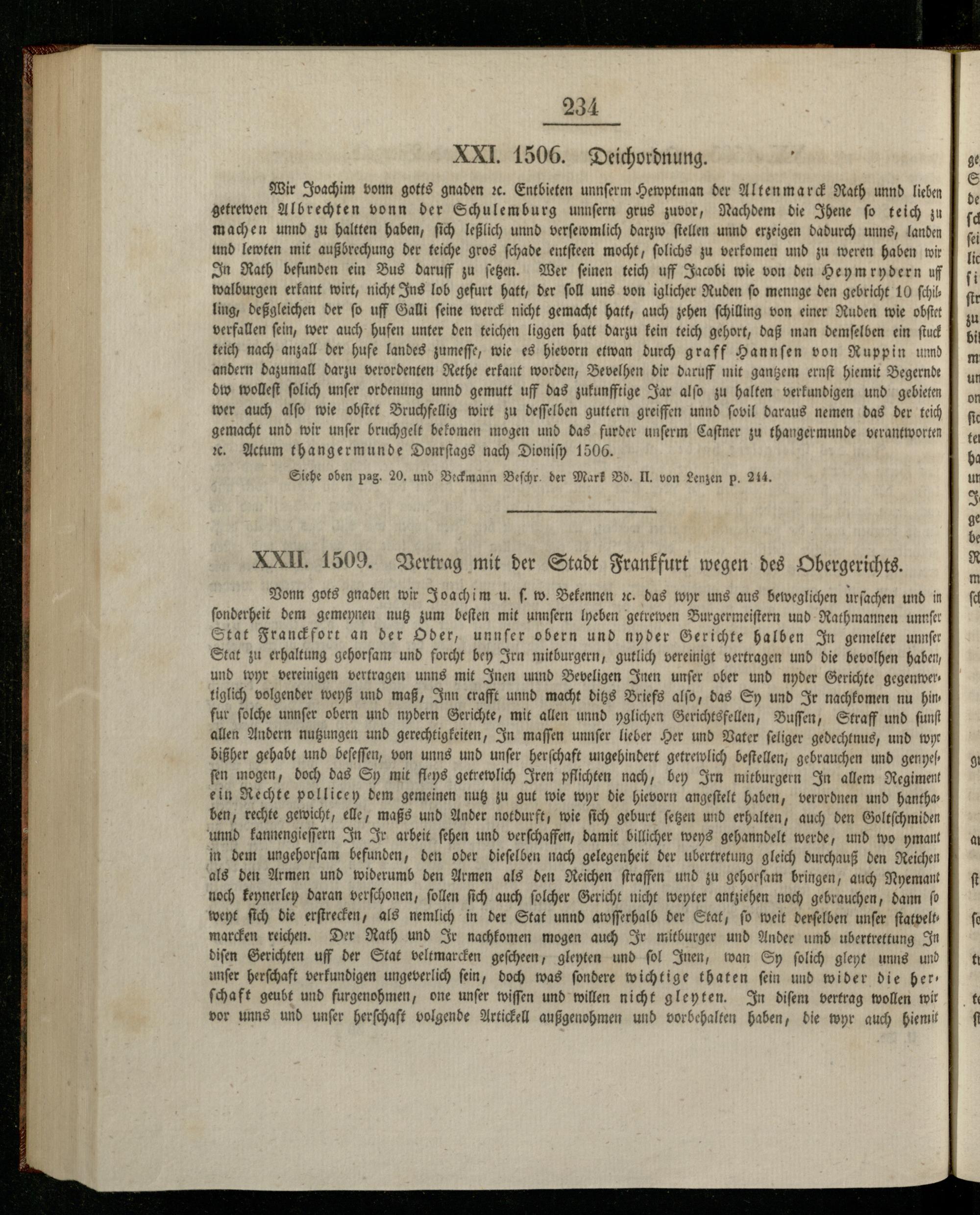 ſonderheit dem gemeynen nutz zum beſten mit unnſern lyeben getrewen Burgermeiſtern und Rathmannen unnſer Stat Franckfort an der Oder, unnſer obern und nyder Gerichte halben In gemelter unnſer Stat zu erhaltung gehorſam und forcht bey Irn mitburgern, gutlich vereinigt vertragen und die bevolhen haben, und wyr vereinigen vertragen unns mit Inen unnd Beveligen Inen unſer ober und nyder Gerichte gegenwertiglich volgender weyß und maß, Inn crafft unnd macht ditzs Briefs alſo, das Sy und Ir nachkomen nu hin fur ſolche unnſer obern und nydern Gerichte, mit allen unnd yglichen Gerichtsfellen, Buſſen, Straff und ſunſt allen Andern nutzungen und gerechtigkeiten, In maſſen unnſer lieber Her und Vater ſeliger gedechtnus, und wyr bißher gehabt und beſeſſen, von unns und unſer herſchaft ungehindert getrewlich beſtellen, gebrauchen und genyeſſen mogen, doch das Sy mit fleys getrewlich Iren pflichten nach, bey Irn mitburgern In allem Regiment ein Rechte pollicey dem gemeinen nutz zu gut wie wyr die hievorn angeſtelt haben, verordnen und hanthaben, rechte gewicht, elle, maßs und Ander notdurft, wie ſich geburt ſetzen und erhalten, auch den Goltſchmiden unnd kannengieſſern In Ir arbeit ſehen und verſchaffen, damit billicher weys gehanndelt werde, und wo ymant in dem ungehorſam befunden, den oder dieſelben nach gelegenheit der ubertretung gleich durchauß den Reichen als den Armen und widerumb den Armen als den Reichen ſtraffen und zu gehorſam bringen, auch Nyemant noch keynerley daran verſchonen, ſollen ſich auch ſolcher Gericht nicht weyter antziehen noch gebrauchen, dann fo weyt ſich die erſtrecken, als nemlich in der Stat unnd awſſerhalb der Stat, fo weit derſelben unſer ſtatvelts marcken reichen. Der Rath und Ir nachkomen mogen auch Ir mitburger und Ander umb ubertrettung In diſen Gerichten uff der Stat veltmarcken geſcheen, gleyten und ſol Inen, wan Sy ſolich gleyt unns und unſer herſchaft verkundigen ungeverlich ſein, doch was ſondere wichtige thaten ſein und wider die her— ſchaft geubt und furgenohmen, one unſer wiſſen und willen nicht gleyten. In diſem vertrag wollen wir vor unns und unſer herſchaft volgende Artickell außgenohmen und vorbehalten haben, die wyr auch hiemit