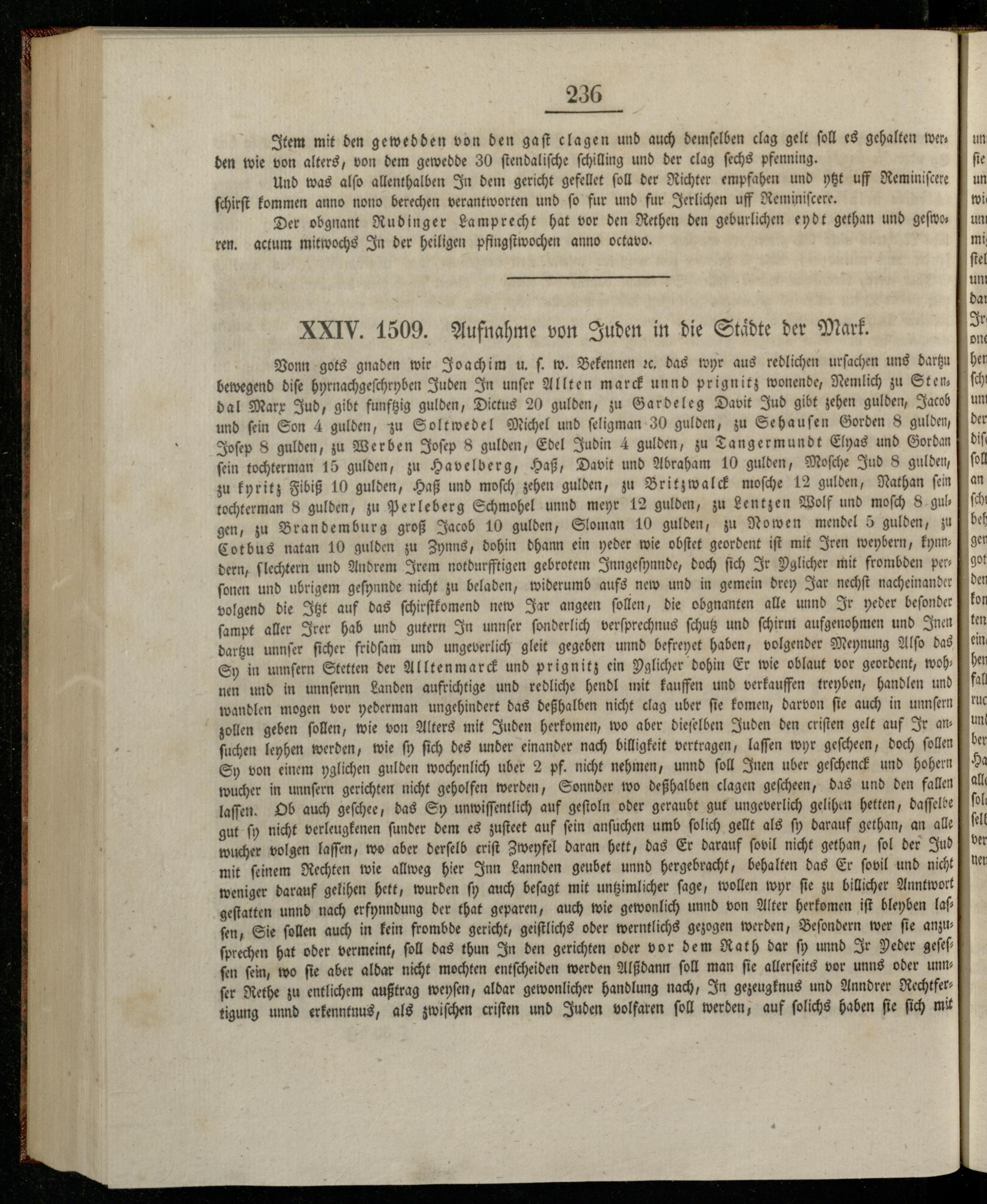 Vonn gots gnaden wir Joachim u. ſ. w. Bekennen 20, das wyr aus redlichen urſachen uns dartzu bewegend diſe hyrnachgeſchryben Juden In unſer Allten marck unnd prignitz wonende, Nemlich zu Sten—| dal Marx Jud, gibt funftzig gulden, Dictus 20 gulden, zu Gardeleg Davit Jud gibt zehen gulden, Jacob und fein Son 4 gulden, zu Soltwedel Michel und ſeligman 30 gulden, zu Sehauſen Gorden 8 gulden, Joſep 8 gulden, zu Werben Joſep 8 gulden, Edel Judin 4 gulden, zu Tangermundt Elyas und Gordan fein tochterman 15 gulden, zu Havelberg, Haß, Davit und Abraham 10 gulden, Moſche Jud 8 gulden, zu kyritz Fibiß 10 gulden, Haß und moſch zehen gulden, zu Britzwalck moſche 12 gulden, Nathan ſein tochterman 8 gulden, zu Perleberg Schmohel unnd meyr 12 gulden, zu Lentzen Wolf und moſch 8 gul= gen, zu Brandem burg groß Jacob 16 gulden, Sloman 10 gulden, zu Nowen mendel 5 gulden, zu Cotbus natan 10 gulden zu Zynns, dohin dhann ein yeder wie obſtet geordent iſt mit Iren weybern, kynn— dern, ſlechtern und Andrem Irem notdurfftigen gebrotem Inngeſynnde, doch ſich Ir Iglicher mit frombden pers ſonen und ubrigem geſynnde nicht zu beladen, widerumb aufs new und in gemein drey Jar nechſt nacheinander volgend die Itzt auf das ſchirſtkomend new Jar angeen ſollen, die obgnanten alle unnd Ir yeder beſonder ſampt aller Irer hab und gutern In unnſer ſonderlich verſprechnus ſchutz und ſchirm aufgenohmen und Inen dartzu unnſer ſicher fridſam und ungeverlich gleit gegeben unnd befreyet haben, volgender Meynung Alſo das Sy in unnſern Stetten der Alltenmarck und prignitz ein Yglicher dohin Er wie oblaut vor geordent, woh— nen und in unnſernn Landen aufrichtige und redliche hendl mit kauffen und verkauffen treyben, handlen und wandlen mogen vor yederman ungehindert das deßhalben nicht clag uber ſie komen, darvon ſie auch in unnſern zollen geben ſollen, wie von Alters mit Juden herkomen, wo aber dieſelben Juden den criſten gelt auf Ir an ſuchen leyhen werden, wie ſy ſich des under einander nach billigkeit vertragen, laſſen wyr geſcheen, doch ſollen Sy von einem yglichen gulden wochenlich uber 2 pf. nicht nehmen, unnd ſoll Inen uber geſchenck und hohern wucher in unnſern gerichten nicht geholfen werden, Sonnder wo deßhalben clagen geſcheen, das und den fallen laſſen. Ob auch geſchee, das Sy unwiſſentlich auf geſtoln oder geraubt gut ungeverlich gelihen hetten, daſſelbe gut ſy nicht verleugkenen ſunder dem es zuſteet auf ſein anſuchen umb ſolich gellt als ſy darauf gethan, an alle wucher volgen laſſen, wo aber derſelb criſt Zweyfel daran hett, das Er darauf ſovil nicht gethan, ſol der Jud mit ſeinem Rechten wie allweg hier Inn Lannden geubet unnd hergebracht, behalten das Er ſovil und nicht weniger darauf gelihen hett, wurden ſy auch beſagt mit untzimlicher ſage, wollen wyr fie zu billicher Anntwort geſtatten unnd nach erfynndung der that geparen, auch wie gewonlich unnd von Alter herkomen iſt bleyben la fen, Sie ſollen auch in kein frombde gericht, geiſtlichs oder werntlichs gezogen werden, Beſondern wer ſie anzuſprechen hat oder vermeint, ſoll das thun In den gerichten oder vor dem Rath dar ſy unnd Ir Jeder geſe ſen ſein, wo ſie aber aldar nicht mochten entſcheiden werden Alßdann ſoll man ſie allerſeits vor unns oder unnfer Nethe zu entlichem außtrag weyſen, aldar gewonlicher handlung nach, In gezeugknus und Anndrer Rechtfertigung unnd erkenntnus, als zwiſchen criſten und Juden volfaren ſoll werden, auf ſolichs haben ſie ſich mit