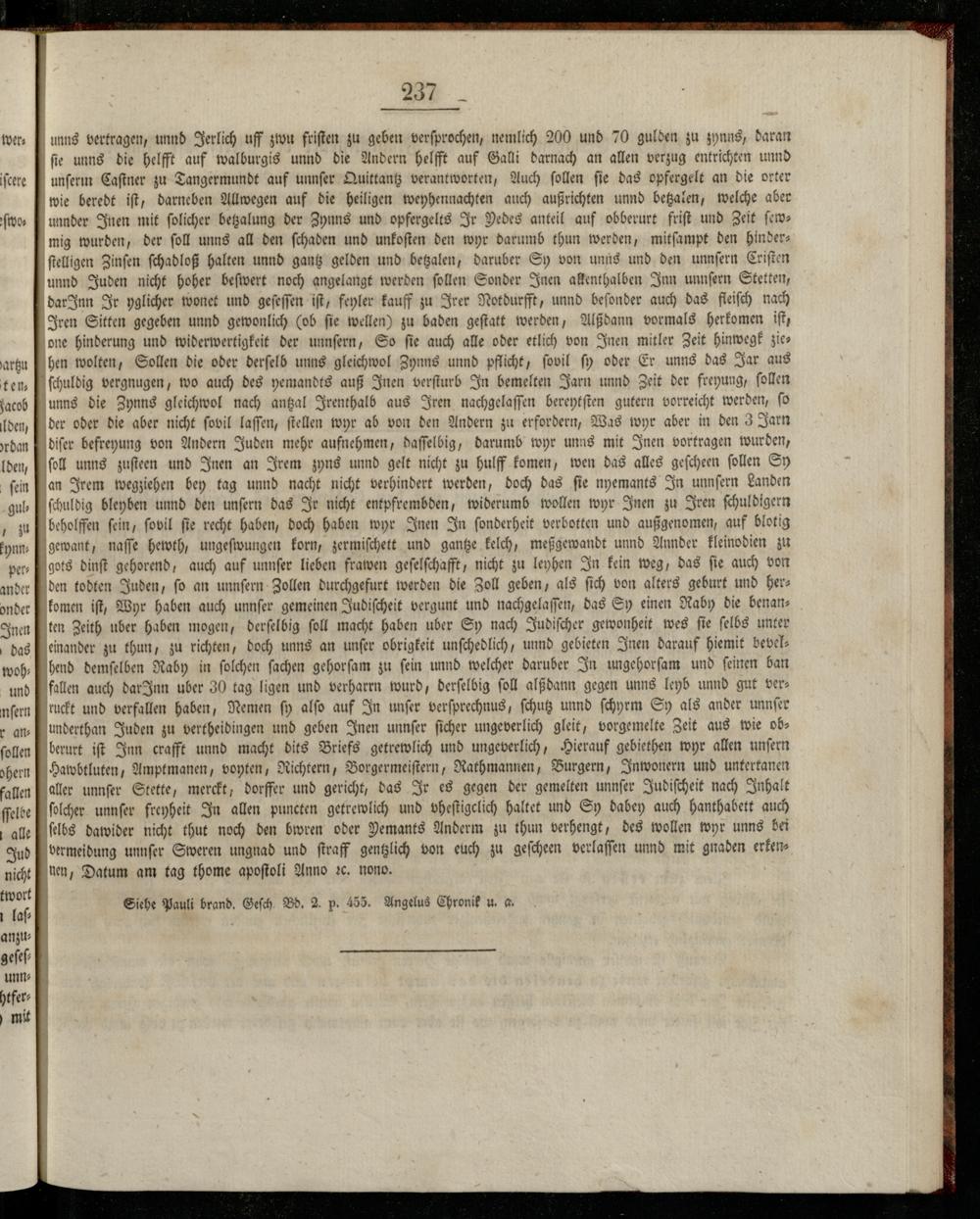 ten Zeith uber haben mogen, derſelbig ſoll macht haben uber Sy nach Judiſcher gewonheit wes ſie ſelbs unter einander zu thun, zu richten, doch unns an unſer obrigkeit unſchedlich, unnd gebieten Inen darauf hiemit bevelhend demſelben Raby in ſolchen ſachen gehorſam zu fein unnd welcher daruber In ungehorſam und ſeinen ban fallen auch dar Inn uber 30 tag ligen und verharrn wurd, derſelbig ſoll alßdann gegen unns leyb unnd gut vers ruckt und verfallen haben, Nemen ſy alſo auf In unſer verſprechnus, ſchutz unnd ſchyrm Sy als ander unnſer underthan Juden zu vertheidingen und geben Inen unnſer ſicher ungeverlich gleit, vorgemelte Zeit aus wie obberurt iſt Inn crafft unnd macht dies Briefs getrewlich und ungeverlich, Hierauf gebiethen wyr allen unſern