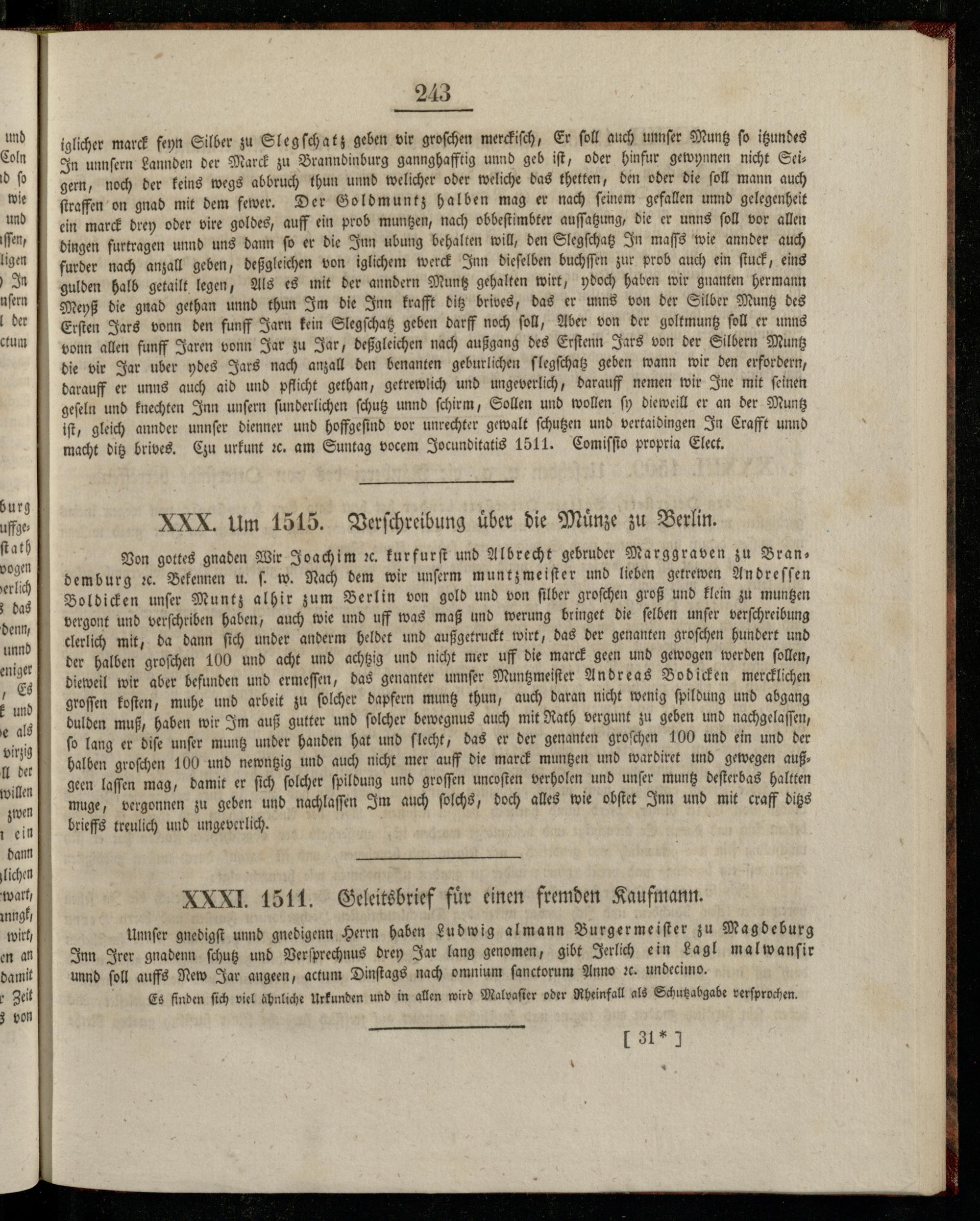 XXX. Um 1515. Verſchreibung uͤber die Muͤnze zu Berlin. Von gottes gnaden Wir Joachim ꝛc. kur fur ſt und Albrecht gebruder Marggraven zu Bran