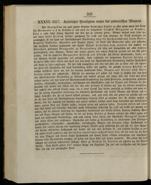 XXXVI. 1517. Kaiſerliches Privilegium wegen des pommerſchen Wappens.