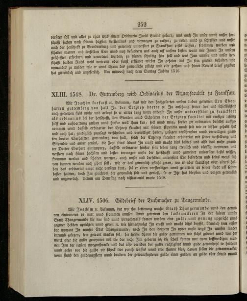 Wir Joachim kur furſt ꝛc. Bekennen, das wir den hochgelarten unſern lieben getrewen Ern Eberharten guttemberg von hall In der Ertzney doctor ꝛc. In anſehung feiner lere und ſchicklichkeit auch getrewen fleis muhe und arbeyt fo er ettwa lang vonn anbegin In unſer univerſſitet zu franckfort als ordinarius bei der herſchafft, den Stenden unnd Scholaren der Ertzney facultet mit emſiger leſung hilff und auſwarttung gethan unnd hinfur woll thun kan, ſoll unnd mag, forder zw ordinarien daſelbſt auffges nommen unnd daſſelb ordinariat der Ertzney facultet mit ſeinem ſtipendio unnd ſolt wie er biſher gehabt hat und noch hat, gnediglich zugeſagt verſchriben und verwilliget haben, zuſagen verſchreyben unnd verwilligen gnanten doctor Eberhartten guttemberg von hall, ſolch der Ertzeney facultet ordinariat mit ſeiner verſoldung und Stipendio und ander genies, die Zeyt ſeins lebens In crafft und macht dits brives und alſo das mehr gnantter Doctor Eberhart guttemperg, daſſelb ordinariat hinfur ſein leben lang treulich und vleiſſig verwaren und verſteen nach ſeinen hochſten und beſten vermogen unſer der herſchafft unnd gemeiner univerſitet beſts wiſſen, frommen werben und ſchaden warnen, auch unſer und derſelben univerſitet Ere befordern und keins wegs ſich von dannen wenden noch zihen ſoll, wie er des gewonlich pflicht getan, wo er aber kranckeyt oder alters hal ben das ordinariat ampt nicht verſteen Font, fol er einen vorſtendigen unnd gelartten an feiner ſtabt uff feinen koſten haltten, doch Im gleichwol der gewonlich ſolt und genieß, ſo er Itzt hat bleyben und volgen getreulich und ungeverlich. Actum am Donrſtag nach viſitationis marie 1518.
